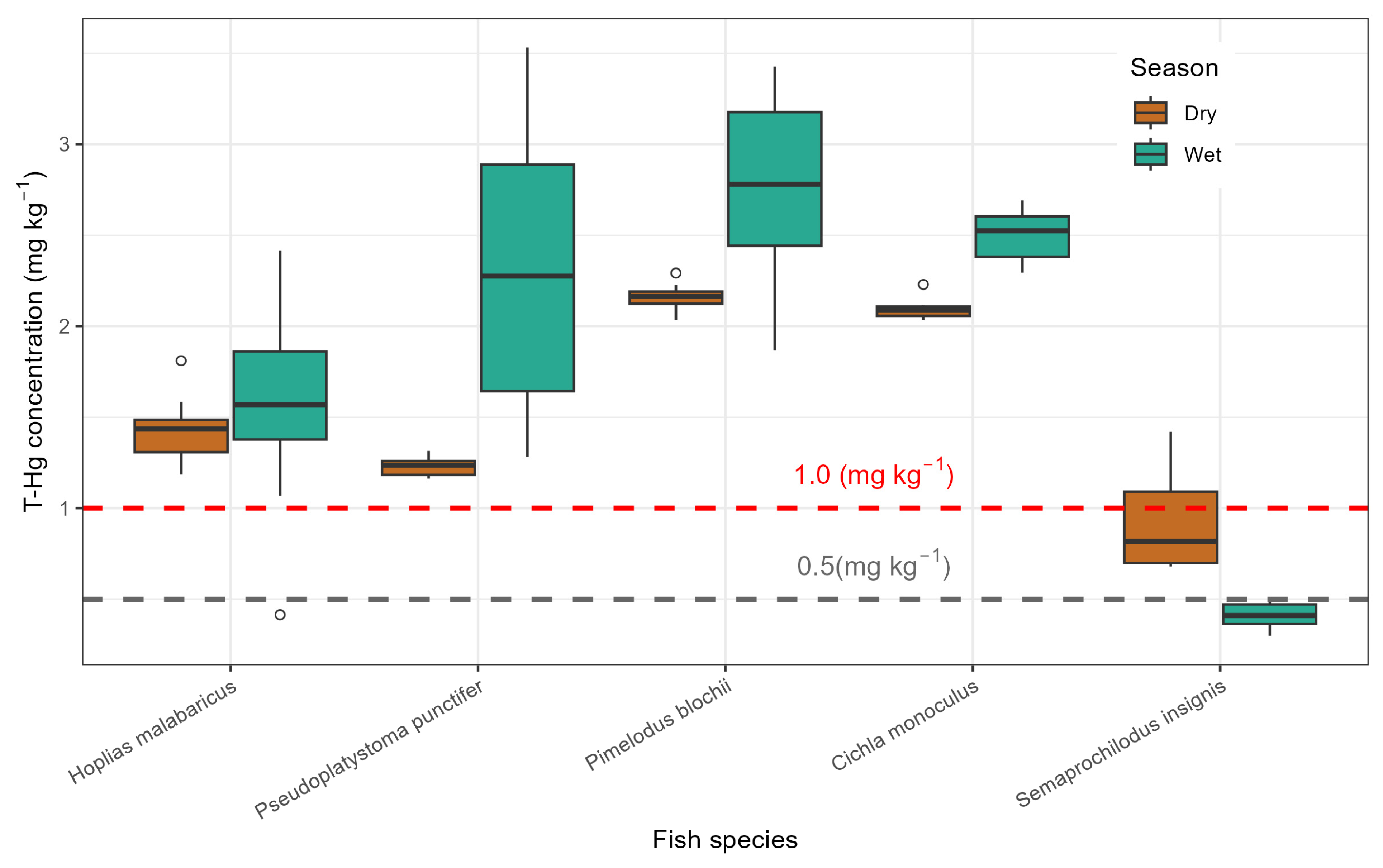 - Silva, S.F.d.; Oliveira, D.C.; Pereira, J.P.G.; Castro, S.P.; Costa, B.N.S.; Lima, M.d.O. Seasonal variation of mercury in commercial fishes of the Amazon Triple Frontier, Western Amazon Basin. Ecol. Indic. 2019, 106, 105549. [Google Scholar] [CrossRef]