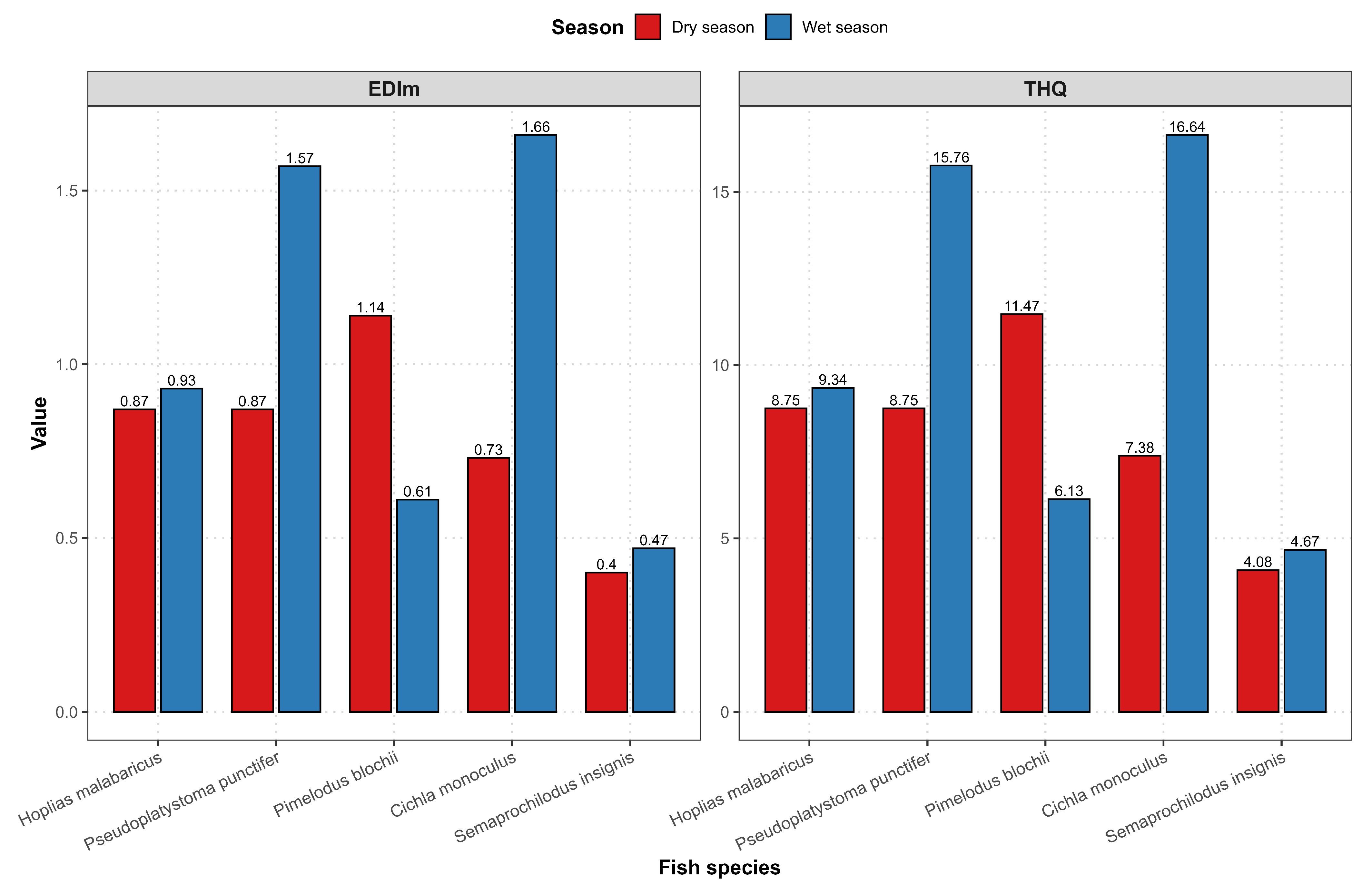 | Species (Wet Season) | Trophic Level | EDIm | THQ | CRmw |