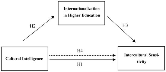 Although the relationship between Cultural Intelligence (CI) and Intercultural Sensitivity (IS) has received substantial empirical attention, existing studies have predominantly framed this relationship at the individual level, focusing on personal traits, motivational orientations, and cognitive-affective mechanisms [1,23,24,25]. These constructs have largely been conceptualised as individual competencies developed through personal experiences or learning strategies, with limited attention to the role of institutional structures in shaping them. What remains underexplored is how institutional mechanisms—particularly the organisational processes of Internationalisation in Higher Education (IHE)—mediate the transformation of cognitive–behavioural competencies associated with CI into the affective and participatory orientations reflected in IS. Prior research has typically treated IHE as a static context or an outcome, focusing on aspects such as student mobility or curriculum policy, rather than as a dynamic and transformative mediating factor in intercultural competence development [3,6,8,26]. By positioning IHE as a mediating variable, this study shifts the analytical focus from individual-level traits to institutional-level processes, offering a novel and contextually grounded understanding of how intercultural learning and engagement can be structured and enhanced in globalised academic environments.