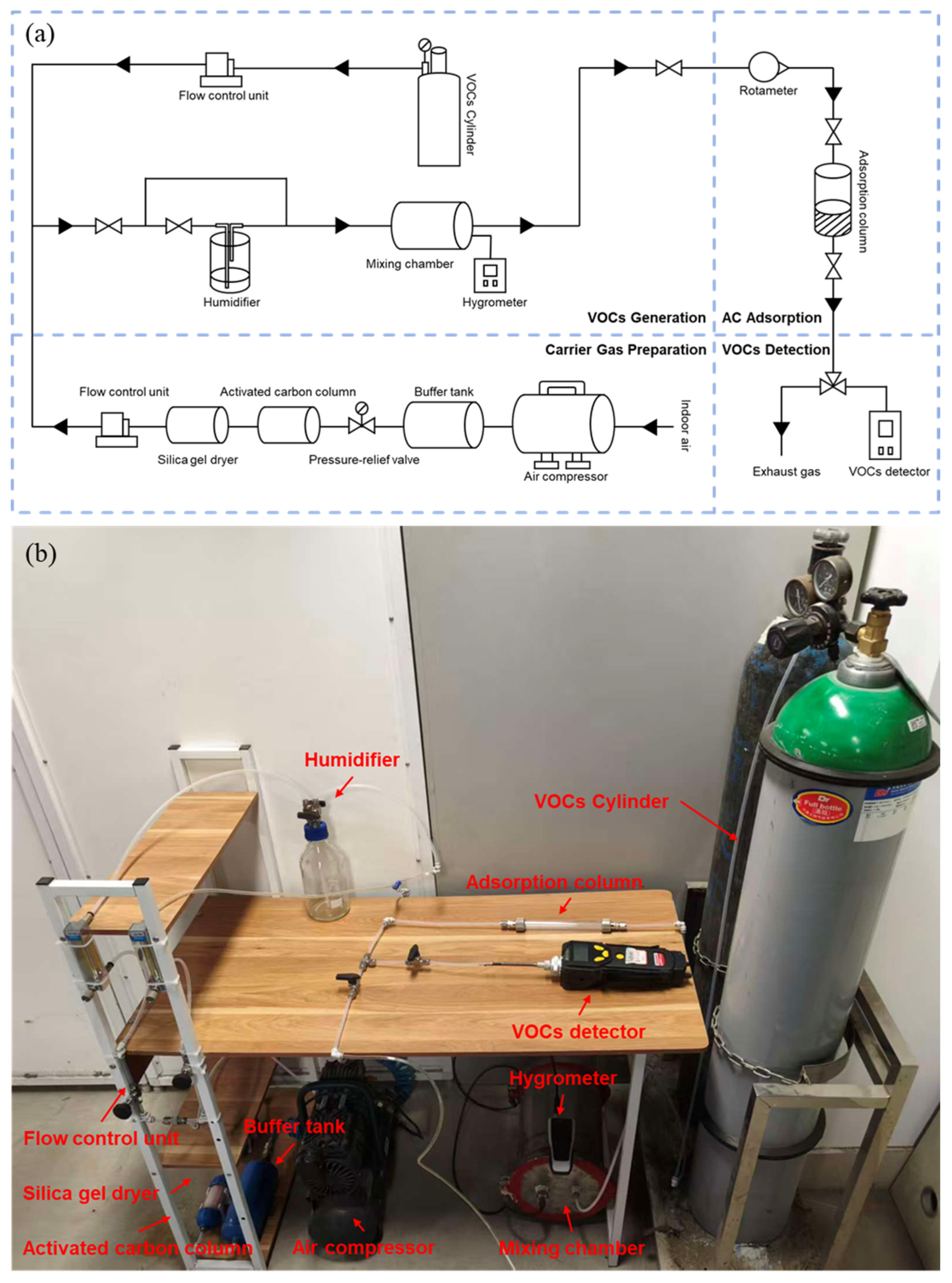 - Li, J.J.; Yin, T.Y.; Cheng, T.; Chen, H.; Yang, L.; Wu, H. Superior pore size for enhancing the competitive adsorption of VOCs under high humid conditions: An experiment and molecular simulation study. J. Environ. Chem. Eng. 2023, 11, 111091. [Google Scholar] [CrossRef]