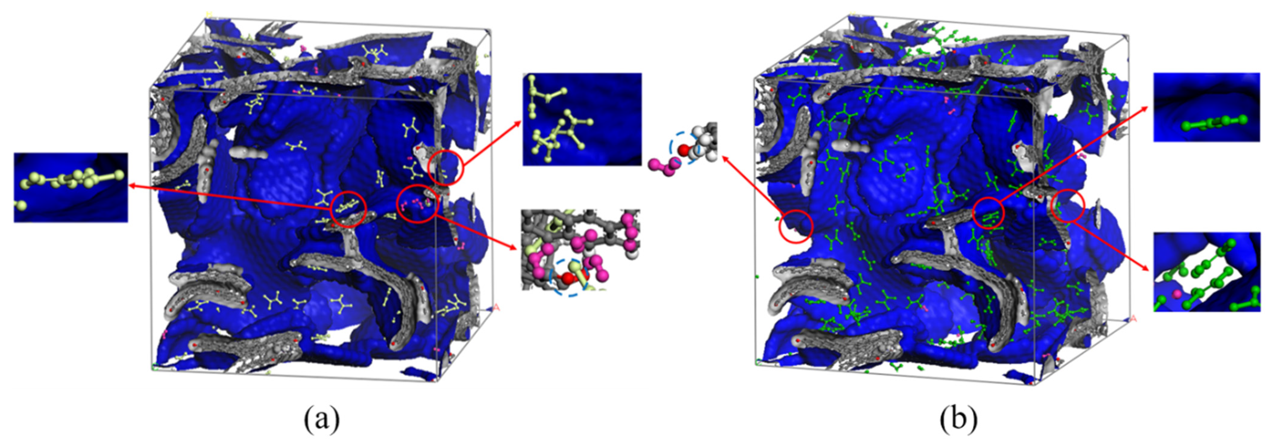 - Chen, Z.; He, R. Competitive adsorption characteristics of gasoline evaporated VOCs in microporous activated carbon by molecular simulation. J. Mol. Graph. Model. 2023, 121, 108444. [Google Scholar] [CrossRef]