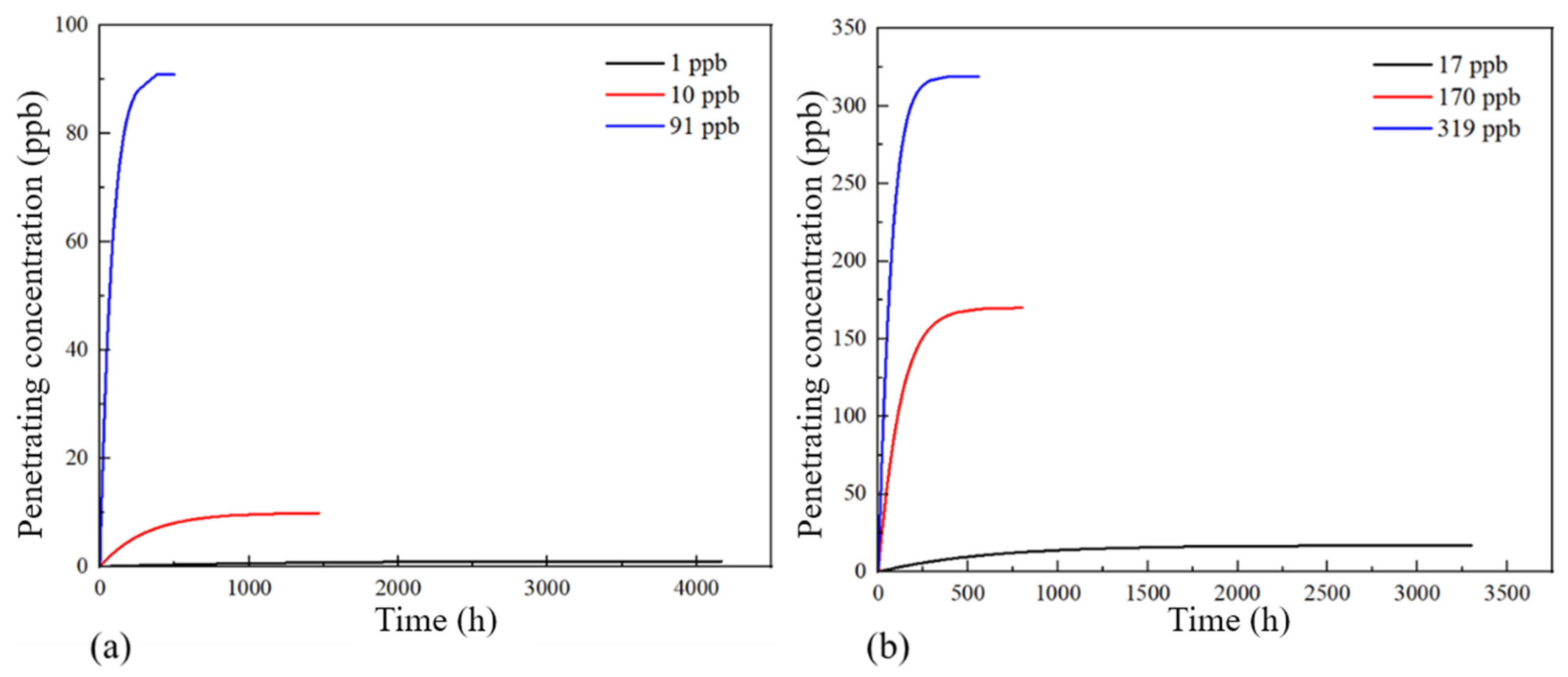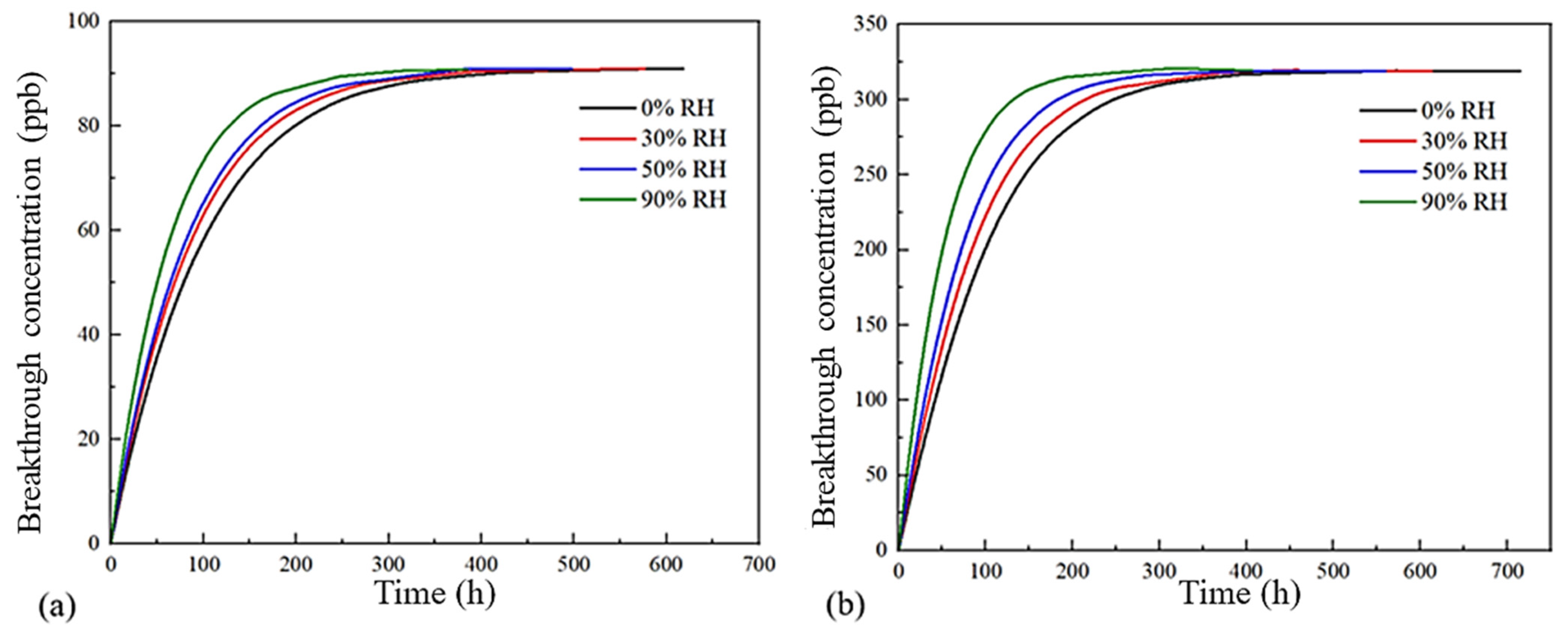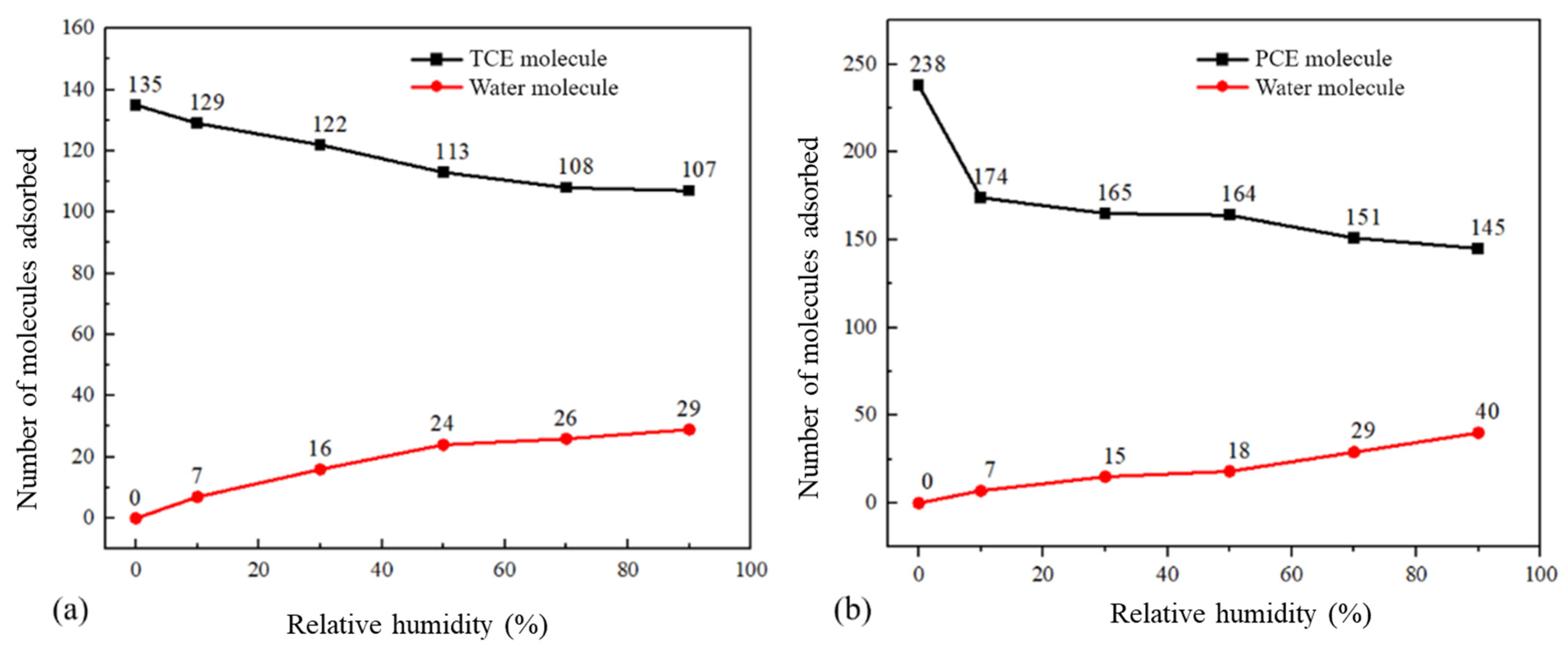 - Coconut shell-based activated carbon exhibited effective adsorption of gaseous chlorinated hydrocarbons, exhibiting a substantially higher adsorption capacity for perchloroethylene (PCE) compared to trichloroethylene (TCE). However, its performance was more sensitive to humidity, with the adsorption capacity decreasing by approximately 30% at a relative humidity (RH) of 50%. This behavior can be attributed to the non-polar nature of PCE and the preferential adsorption of water molecules at oxygen-containing sites on the activated carbon surface. Further investigation into functional modifications of activated carbon, such as hydrophobic surface treatments, is warranted to mitigate the adverse effects of humidity on its adsorption efficiency.