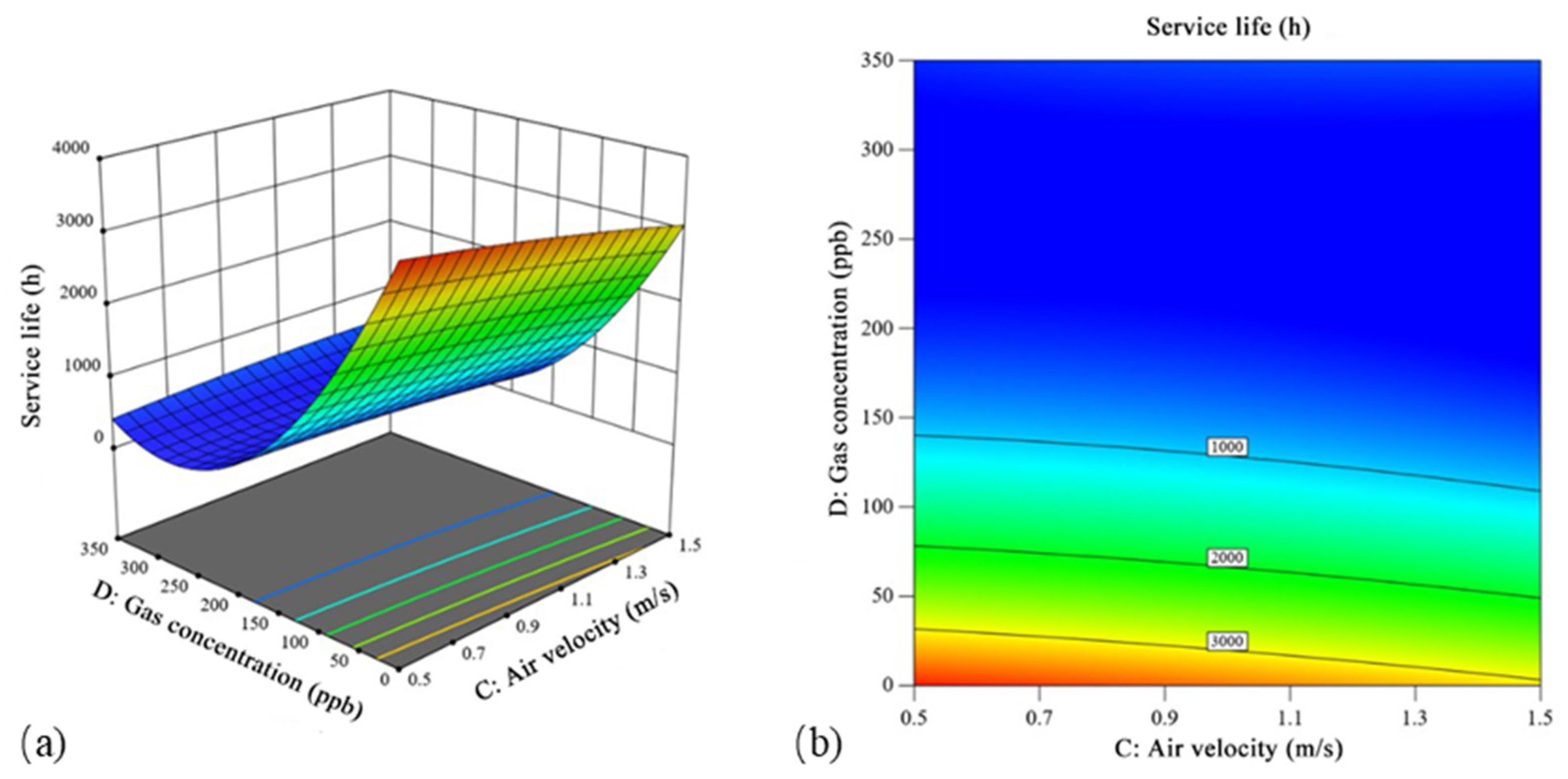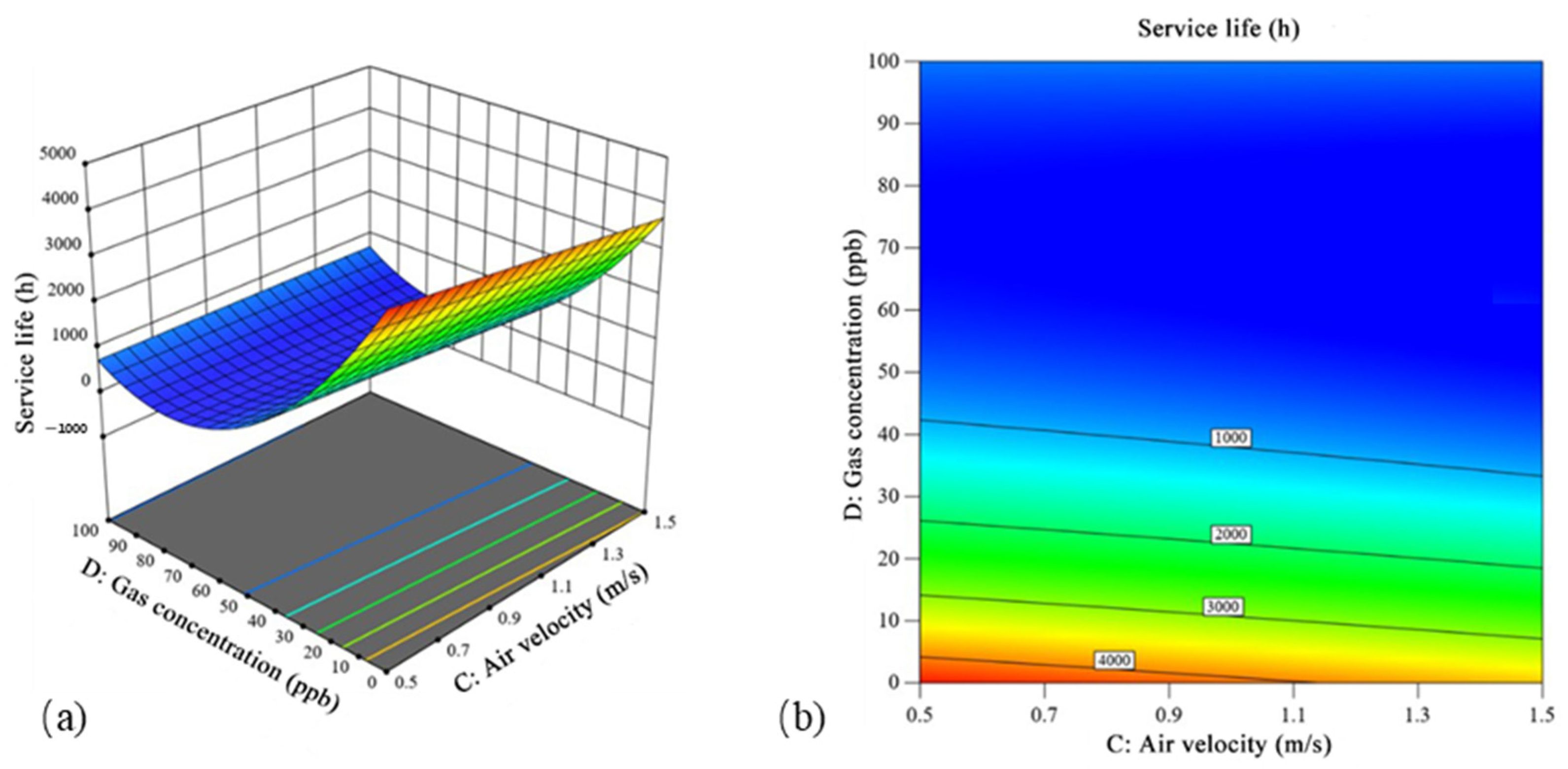 - Response surface methodology analysis revealed that the relative influence of operating parameters on TCE/PCE adsorption decreases in the following order: pollutant concentration > relative humidity > air velocity > temperature. Maintaining inlet concentrations (TCE < 7 ppb, PCE < 30 ppb), air velocity (<1 m/s), temperature (<25 °C), and relative humidity (<50%) can effectively balance purification efficiency and activated carbon lifetime (3–5 months).