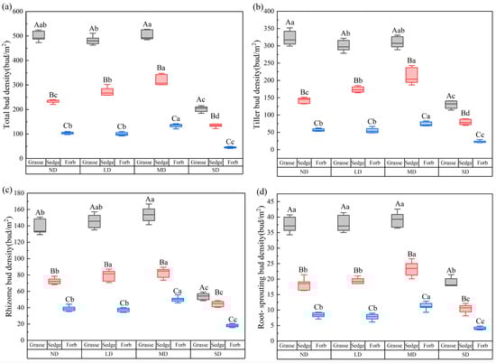 Variations in belowground bud density across degradation gradients for three plant functional groups. Uppercase letters indicate significant differences among functional groups within the same degradation level (p < 0.05), whereas lowercase letters indicate significant differences among degradation levels within the same functional group (p < 0.05). ND: non-degraded; LD: lightly degraded; MD: moderately degraded; SD: severely degraded. (a) Variations in total belowground bud density across degradation gradients for three plant functional groups; (b) Variations in tiller bud density across degradation gradients for three plant functional groups; (c) Variations in rhizome bud density across degradation gradients for three plant functional groups; (d) Variations in root-sprouting bud density across degradation gradients for three plant functional groups.