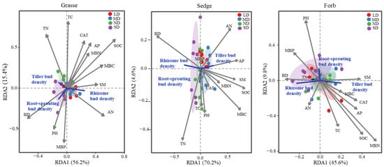 RDA-based relationships between tiller, rhizome, and root-sprouting bud densities and soil environmental variables across degradation gradients for the three plant functional groups. SOC: soil organic carbon, TC: total carbon, TN: total nitrogen, AP: available phosphorus, AN: available nitrogen, SM: soil moisture, BD: soil bulk density, pH, MBC: microbial biomass carbon, MBN: microbial biomass nitrogen, MBP: microbial biomass phosphorus, CAT: catalase activity. Colored points denote sampling plots under four degradation levels (ND, LD, MD, SD), and ellipses represent the 95% confidence intervals for each level.