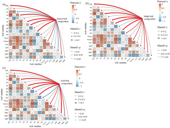 Mantel tests revealed significant and functionally differentiated positive correlations between belowground bud composition and soil variables across the three functional groups (Figure 3). For grasses, belowground bud composition showed highly significant positive correlations with SOC, TP, AP, AK, BD, Sucrase, and MBN (p < 0.01), together with significant positive correlations with TC, CAT, and MBC (0.01 ≤ p < 0.05; Figure 3a). In sedges, belowground bud composition exhibited highly significant positive correlations with SOC, TP, AP, AK, BD, Sucrase, MBN, and MBC (p < 0.01), as well as a significant positive correlation with pH (0.01 ≤ p < 0.05; Figure 3b). Forbs were primarily driven by SOC, TP, AP, AK, BD, Sucrase, MBN, and MBC (p < 0.01), while pH, SM, and MBP also showed significant positive correlations (0.01 ≤ p < 0.05; Figure 3c).