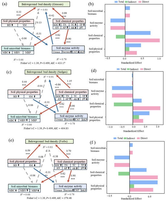 Structural equation models (SEM) illustrating the effects of soil factors on belowground bud density across three plant functional groups. *** p < 0.001, ** p < 0.01. (a) Grasses, (c) Sedges, and (e) Forbs. Red solid arrows indicate significant positive effects, blue solid arrows indicate significant negative effects, and grey dashed arrows represent nonsignificant paths; R2 denotes the explained variance of each endogenous variable. Panels (b,d,f) show the standardized direct (pink), indirect (green), and total (blue) effects of soil factors on belowground bud density for grasses, sedges, and forbs, respectively. Soil physical properties: BD, SM; Soil chemical properties: SOC, TC, TN, TP, AN, AP, AK, pH; microbial biomass: MBC, MBN, MBP; soil enzyme activity: CAT, Urease, Sucrase, AKP. The arrows “↑” and “↓” represent the positive and negative correlations between the corresponding soil factors and belowground buds, respectively, and these correlations were identified through Mantel analysis.