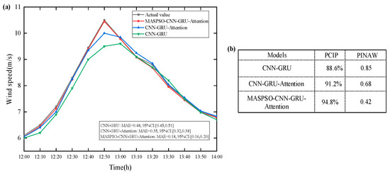 Figure 3a shows that all models generally follow the overall trend of wind speed variation, but clear performance differences appear during rapid changes. Around the peak period near 12:50, the actual wind speed reaches about 10.5 m/s, while the MASPSO-CNN–GRU–Attention model maintains a very small deviation of approximately 0.1 m/s (MAE = 0.18, 95% CI = [0.16, 0.20]), indicating stable prediction accuracy under extreme wind conditions. In contrast, the CNN–GRU–Attention model (MAE = 0.35, 95% CI = [0.32, 0.38]) and the CNN–GRU model (MAE = 0.48, 95% CI = [0.45, 0.51]) exhibit larger errors of roughly 0.3–0.5 m/s and slower responses to the wind speed peak. Moreover, the non-overlapping 95% CIs between the proposed and comparison models (upper bound: 0.20 vs. lower bound: 0.32) confirm the statistical significance of the accuracy improvement, while a PICP close to the nominal 95% level and a PINAW reduction exceeding 40% further demonstrate reliable uncertainty quantification, as shown in Figure 3b.
