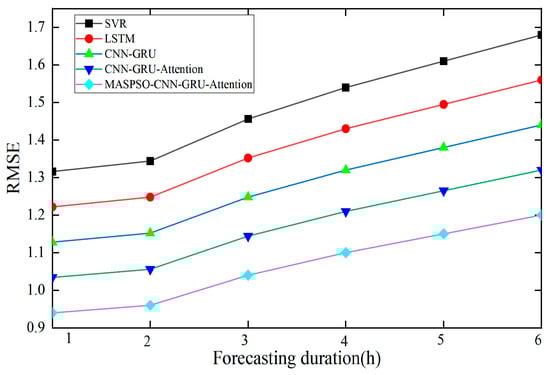 Figure 6 shows that the RMSE of all models increases with the extension of the forecasting horizon. However, baseline models such as SVR and LSTM exhibit a much steeper error growth, particularly at longer horizons. In contrast, the proposed model maintains the lowest RMSE with a relatively smooth increasing trend, indicating effective suppression of error accumulation and superior stability in multi-step wind speed forecasting.