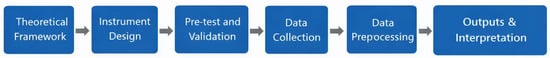 To enhance the clarity, transparency, and reproducibility of the research design, Figure 2 presents a methodological framework diagram that summarises the main stages of the study. The diagram illustrates the logical sequence from the theoretical foundations and instrument design to data collection, preprocessing, statistical analysis, and interpretation of results, highlighting the interconnections among the different methodological components and providing an overview of the research workflow.