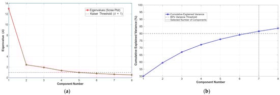 Analysis for selection of the principal components: (a) Kaiser criterion for component selection; (b) cumulative variance 80% Criterion.