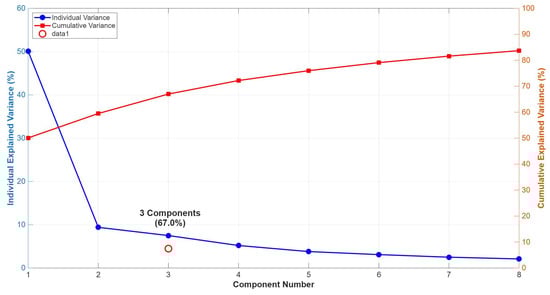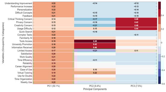 The Principal Component Analysis (PCA) reduced data variability to three principal components that jointly explain 67% of the total variance, supporting the adequacy of the retained dimensional structure, as shown in Figure 7. This variance-based result establishes the statistical basis for examining the relationships among variables related to the perception, use, and impact of Generative Artificial Intelligence (GenAI). Accordingly, the subsequent analysis focuses on the loading patterns of these components to identify how the variables cluster and interact, providing the empirical foundation for the interpretation presented in the following section.