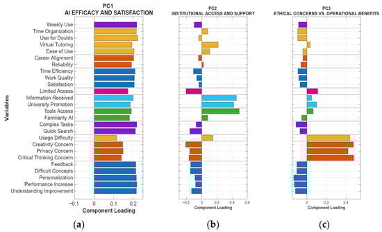 Factor loadings of variables by principal component: (a) PC1 (50.1%) AI Efficacy and Satisfaction; (b) PC2 (9.4%) Institutional Access and Support; (c) PC3 (7.5%) Ethical Concerns vs. Operational Benefits.