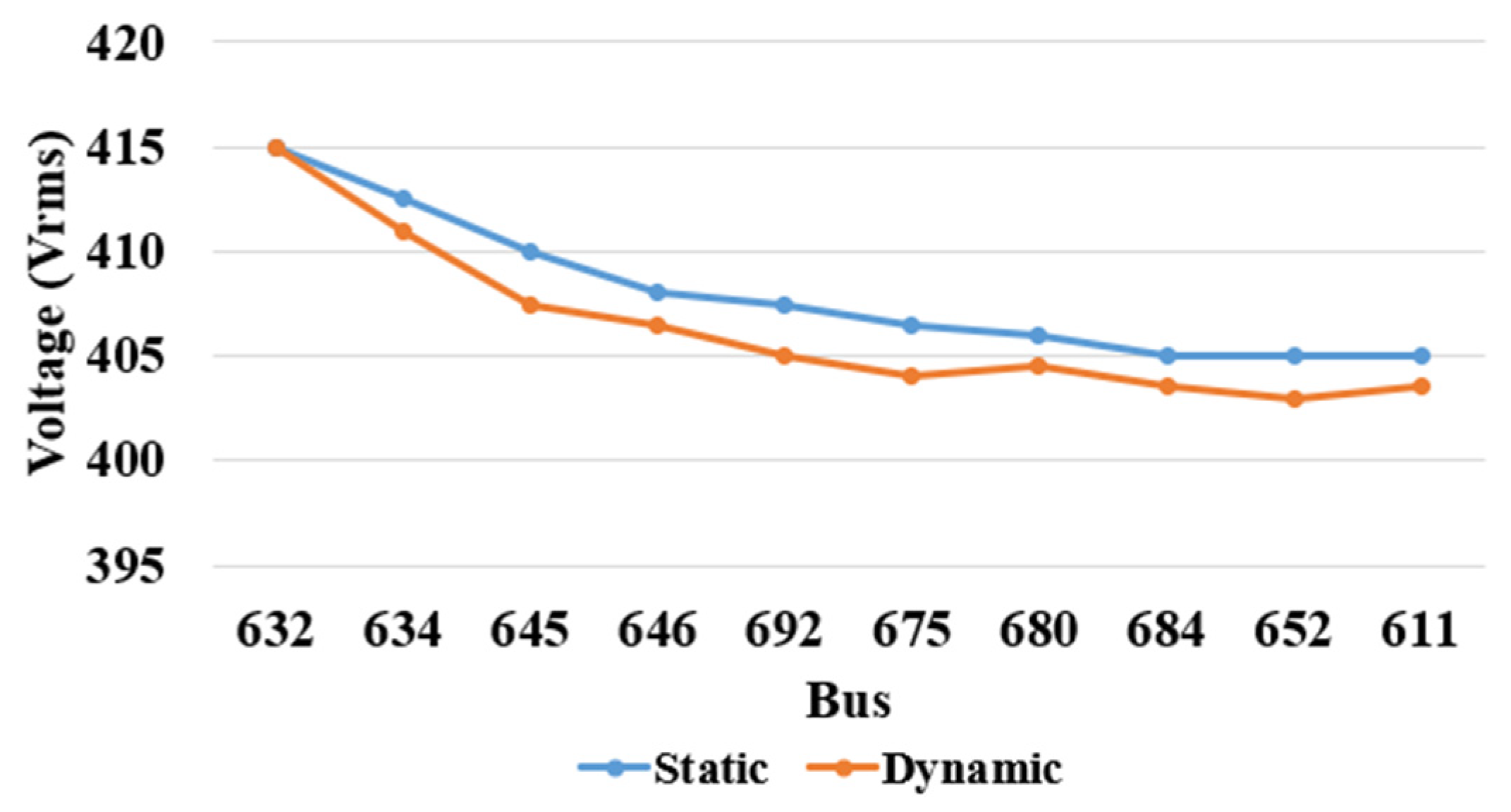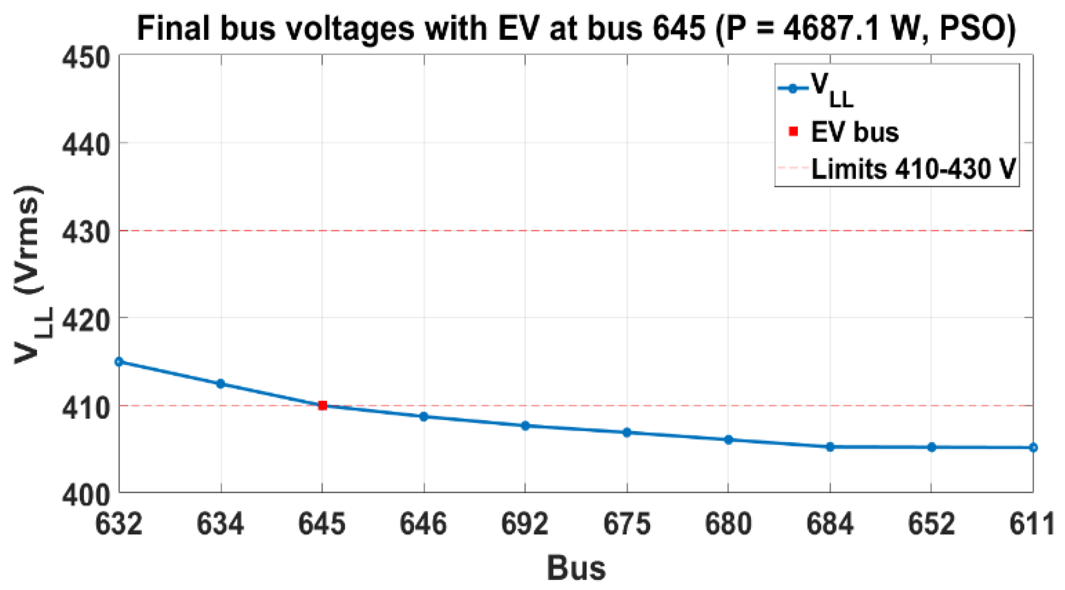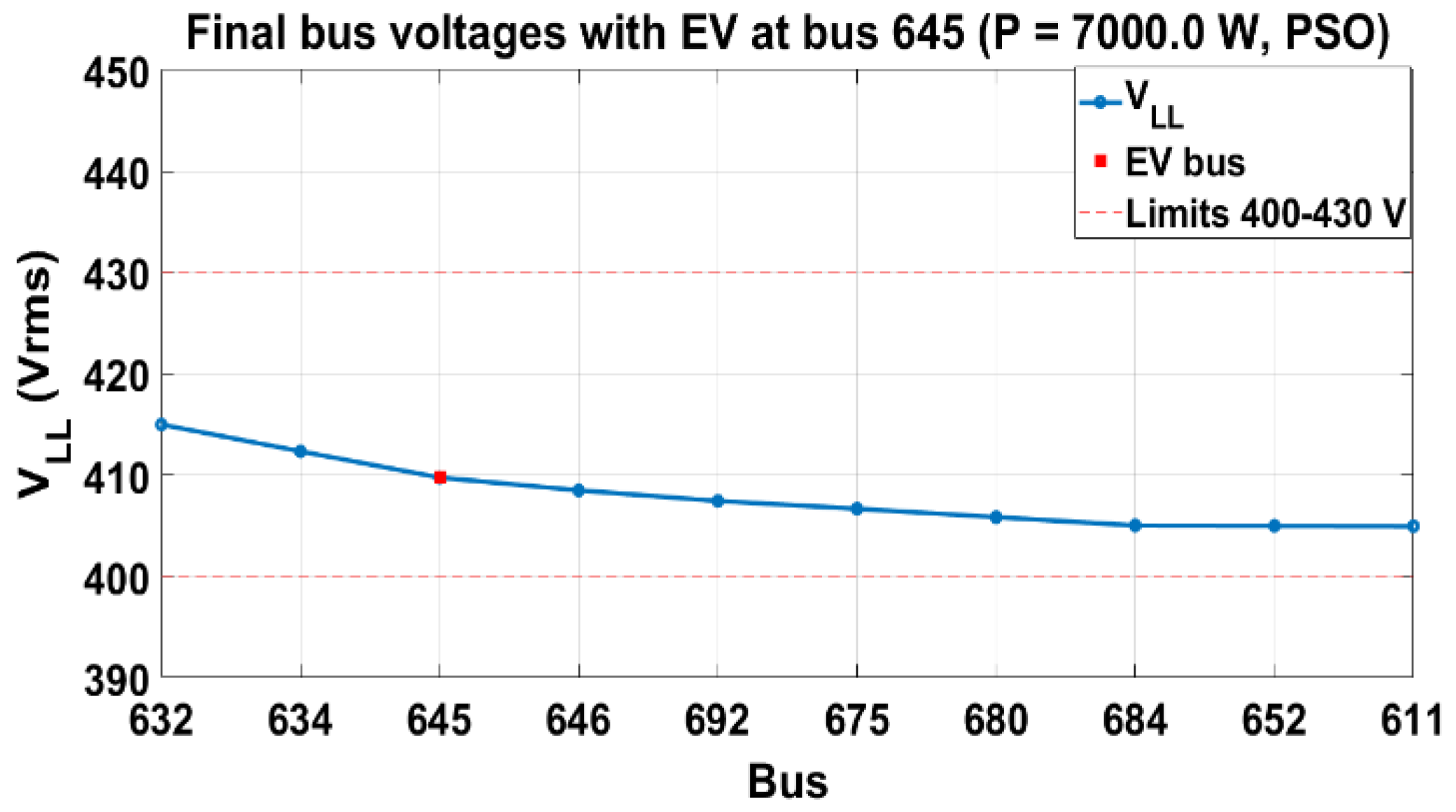 - where is the voltage magnitude at bus i, is the nominal, and are the allowable bounds (e.g., 400–430 Vrms) is the EV charging power decision variable (searched by PSO) varies from 0 to 7 kW. represents the reactive power supported by EV. The rated apparent power is considered 7 kVAR for level 2 chargers. During each iteration, the velocity and position of each particle are updated according to:where and denote the position and velocity of a particle at iteration k, and are the best local and global solutions found so far, is the inertia weight controlling exploration and exploitation, and are the cognitive and social learning coefficients. The PSO process continues until the convergence criterion, defined by a minimum change in the objective function or a maximum number of iterations, is satisfied. The resulting optimal charging power is then applied in the load flow analysis to assess its impact on the network’s voltage profile.