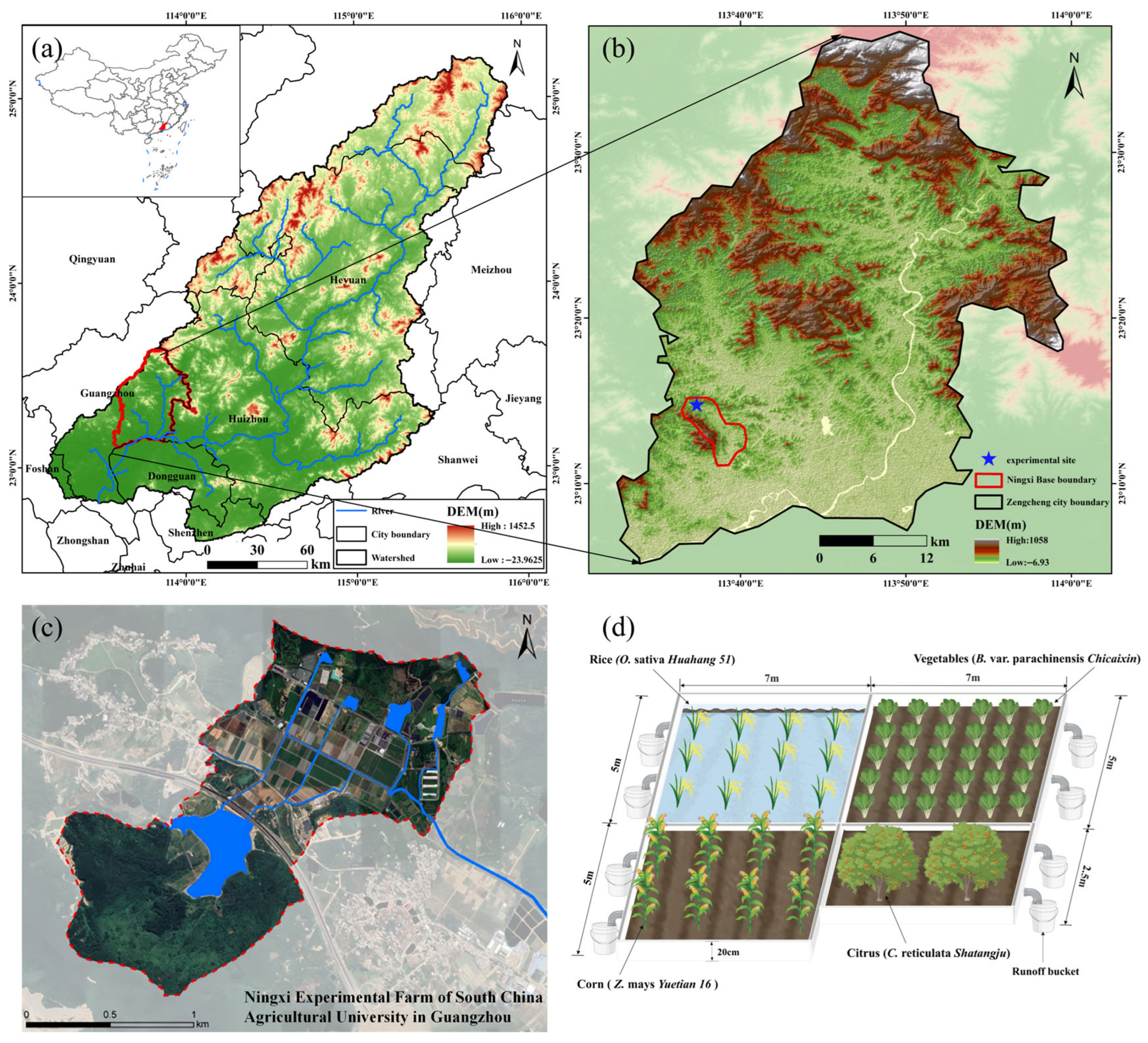 - Zeng, F.F.; Zuo, Z.; Mo, J.C.; Chen, C.Y.; Yang, X.J.; Wang, J.J.; Wang, Y.; Zhao, Z.Q.; Chen, T.Y.; Li, Y.T.; et al. Runoff Losses in Nitrogen and Phosphorus from Paddy and Maize Cropping Systems: A Field Study in Dongjiang Basin, South China. Front. Plant Sci. 2021, 12, 15. [Google Scholar] [CrossRef]