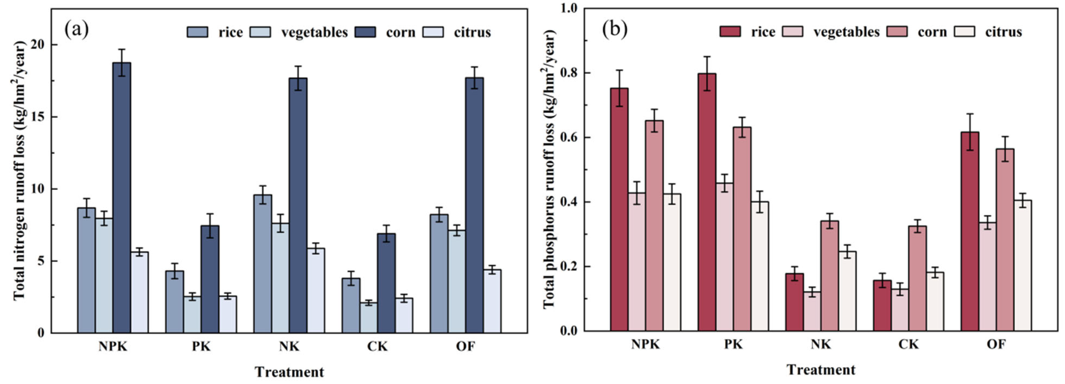 | Crop Type | Treatment | Total Nitrogen Runoff Loss (kg/hm2) | Total Phosphorus Runoff Loss (kg/hm2) | ||||||||