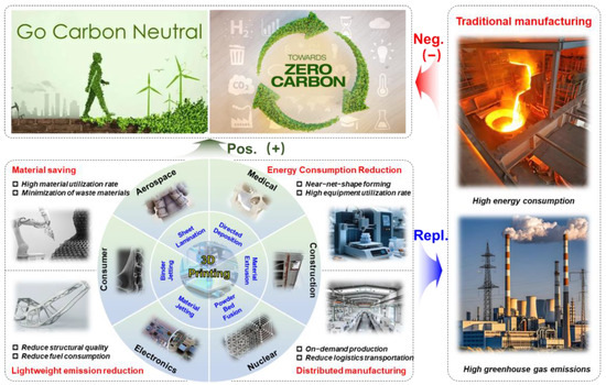 Overview of 3D printing classification, applications, and their advantages for achieving “Dual Carbon” goals. (Note: Pos., positive effect; Repl., replacement of traditional processes; Neg., negative effect.).