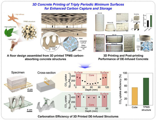 - Yu, K.-H.; Teng, T.; Nah, S.H.; Chai, H.; Zhi, Y.; Wang, K.-Y.; Chi, Y.; Psarras, P.; Akbarzadeh, M.; Yang, S. 3D Concrete Printing of Triply Periodic Minimum Surfaces for Enhanced Carbon Capture and Storage. Adv. Funct. Mater. 2025, 35, 2509259. [Google Scholar] [CrossRef]