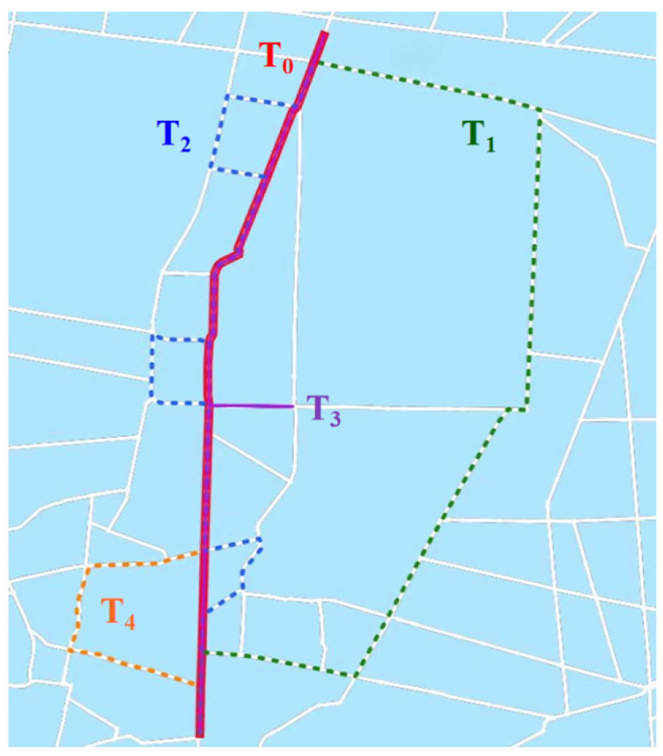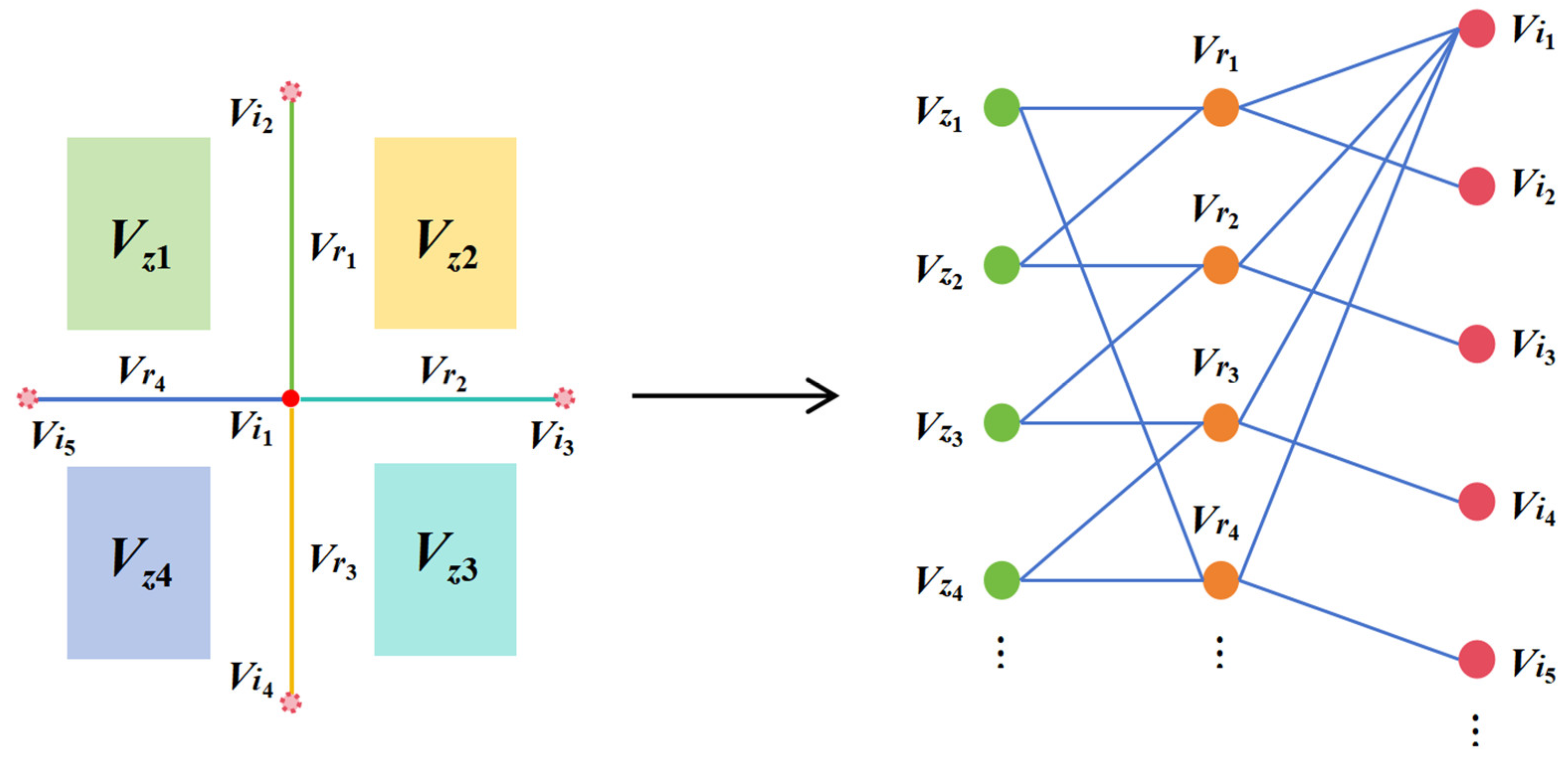 - Regional Indirect Adjacency Matrix . This matrix is used to model the indirect relationships between road segments belonging to the same region. We construct three regional indirect adjacency matrices. If road segments i and j belong to the same region but are not connected via an intersection, then: