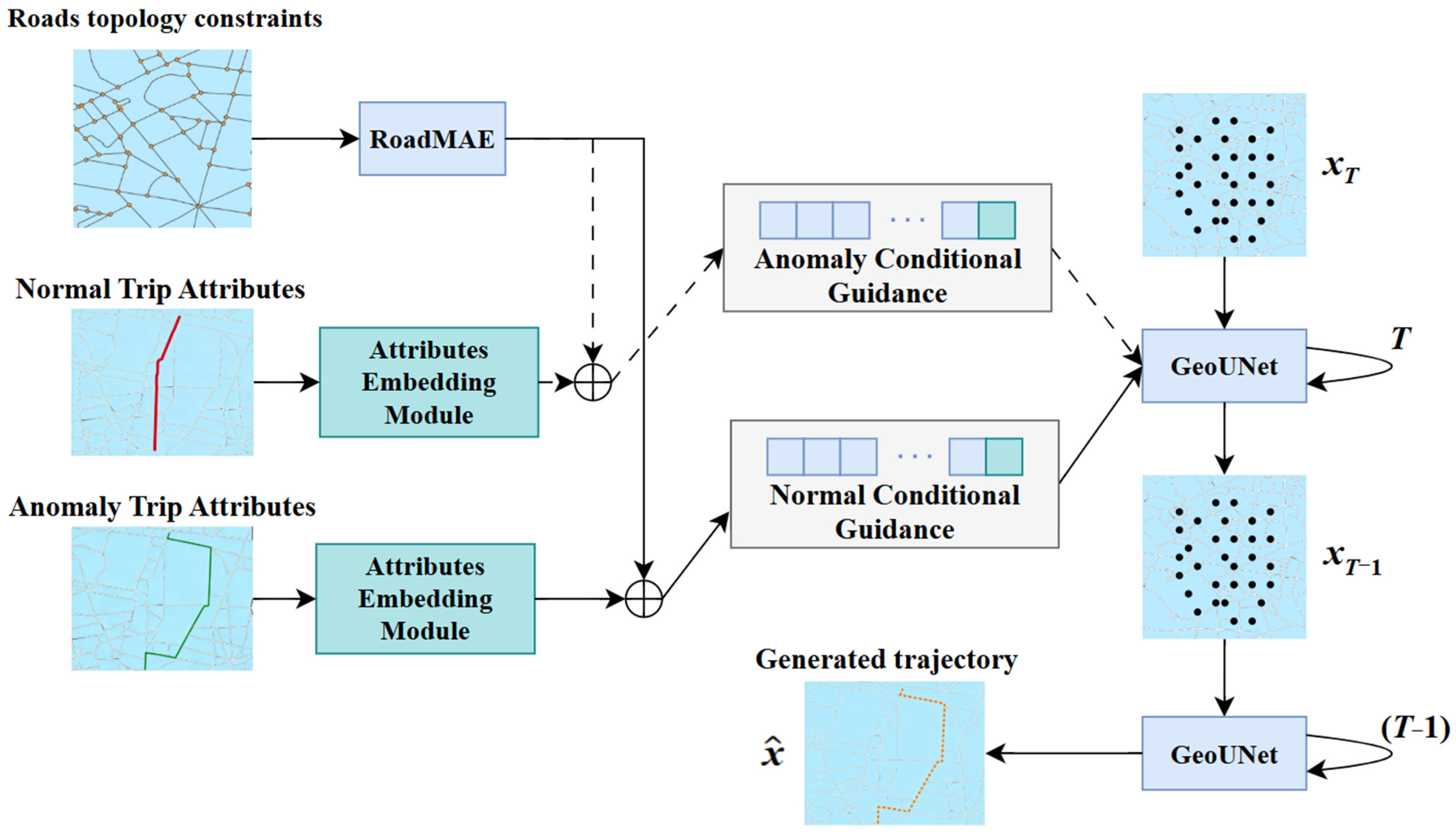 - Zhu, Y.; Ye, Y.; Zhang, S.; Zhao, X.; Yu, J.J. DiffTraj: Generating GPS trajectory with diffusion probabilistic model. In Proceedings of the Thirty-seventh Conference on Neural Information Processing Systems, New Orleans, LA, USA, 10–16 December 2023. [Google Scholar]
