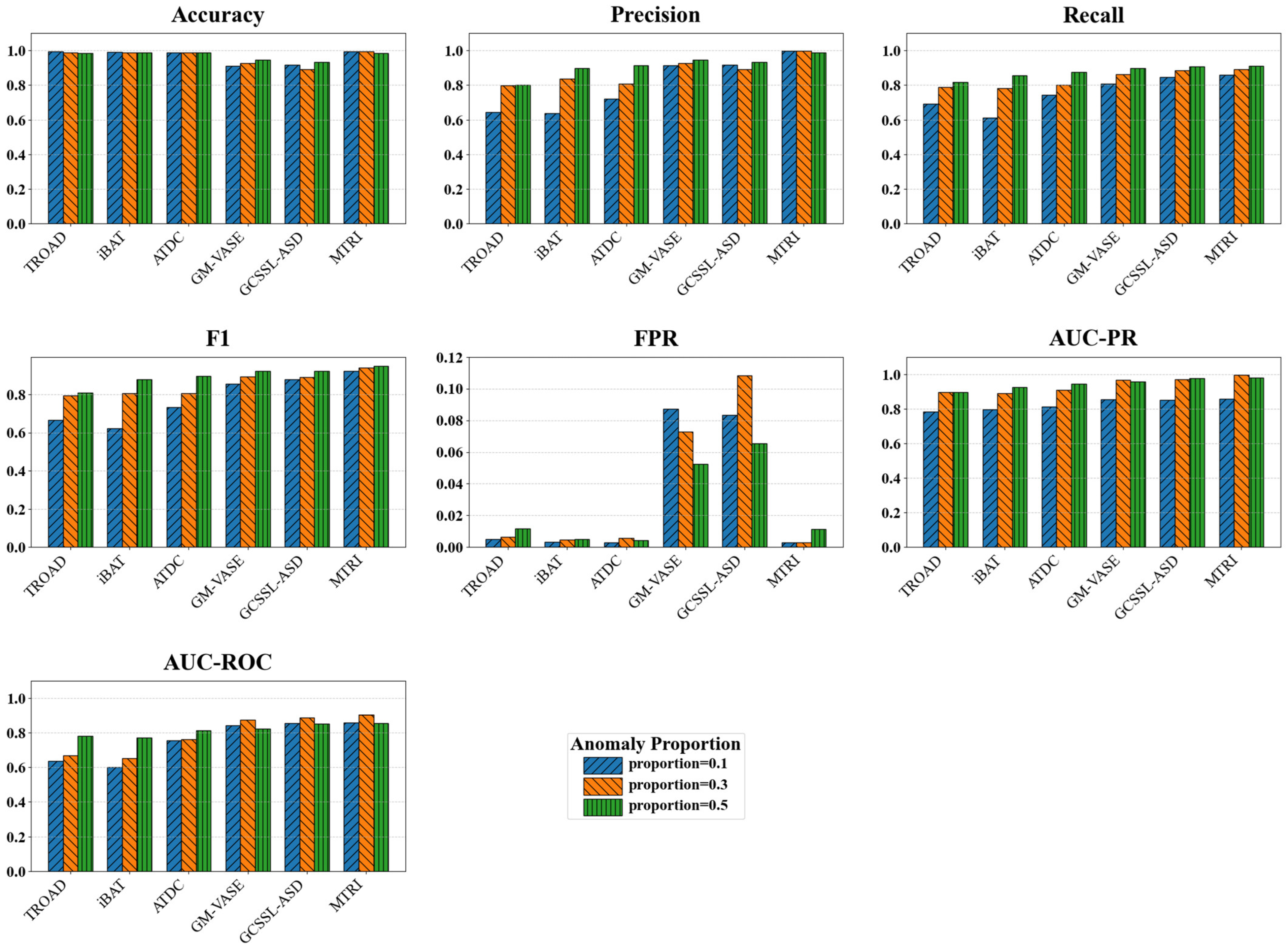 | Anomaly Proportion | Models | Accuracy | Precision | Recall | F1 | FPR | AUC-PR | AUC-ROC |