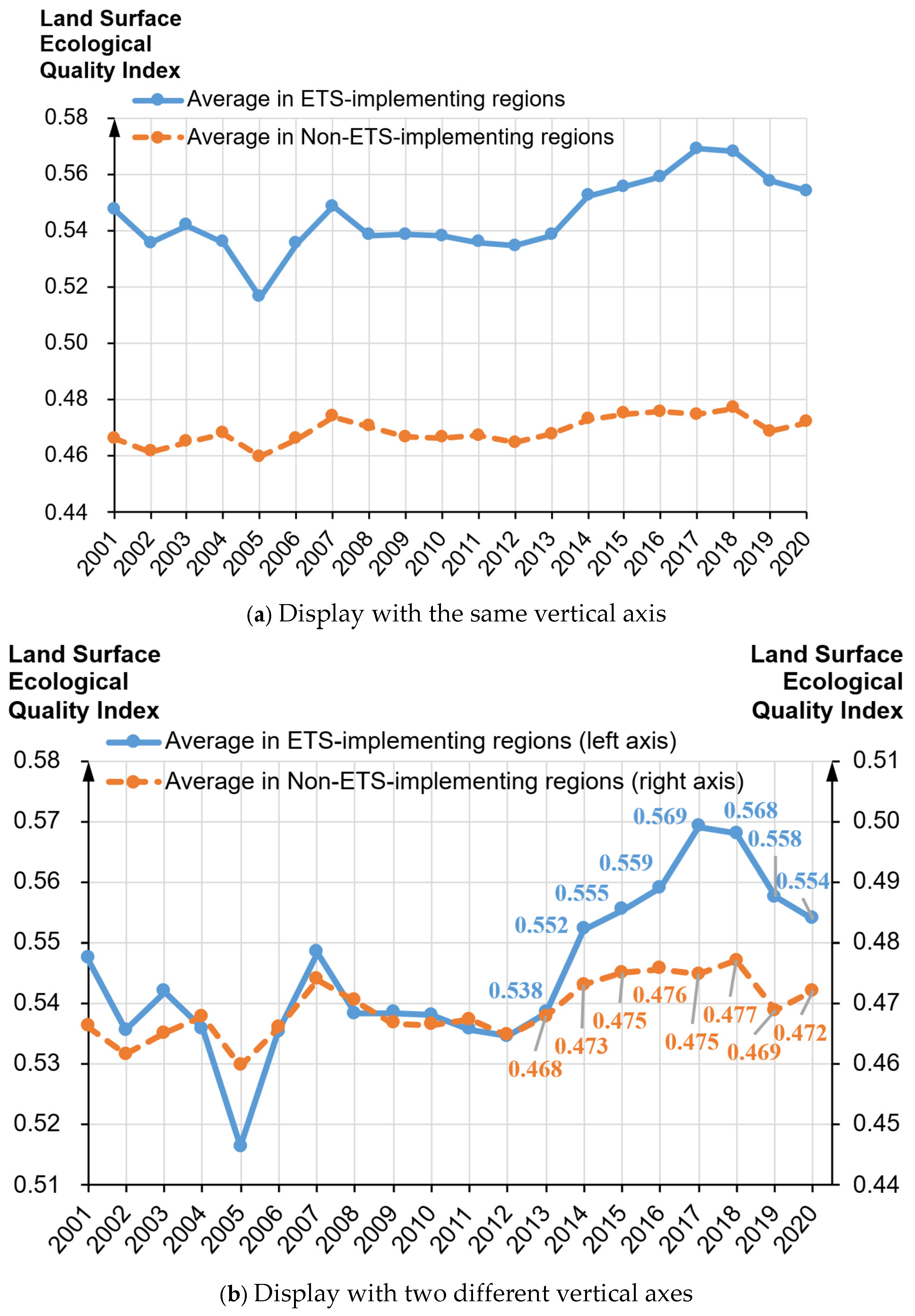 - This study proposes that the implementation of the carbon ETS has been a key contributor to the improvement of China’s land surface ecological quality in recent years. This provides novel insights for a deeper understanding of the dynamics of land eco-environmental status in China. A large amount of the environmental science literature has previously analyzed the determinants of land surface ecological quality. While most of the studies have intensively inspected the impacts of natural factors such as geographic features and climatic conditions or macroeconomic variables such as GDP per capita and population density, fewer have specifically quantified the effect of a particular public policy. This study offers empirical evidence that well-designed public policies can generate beneficial effects.