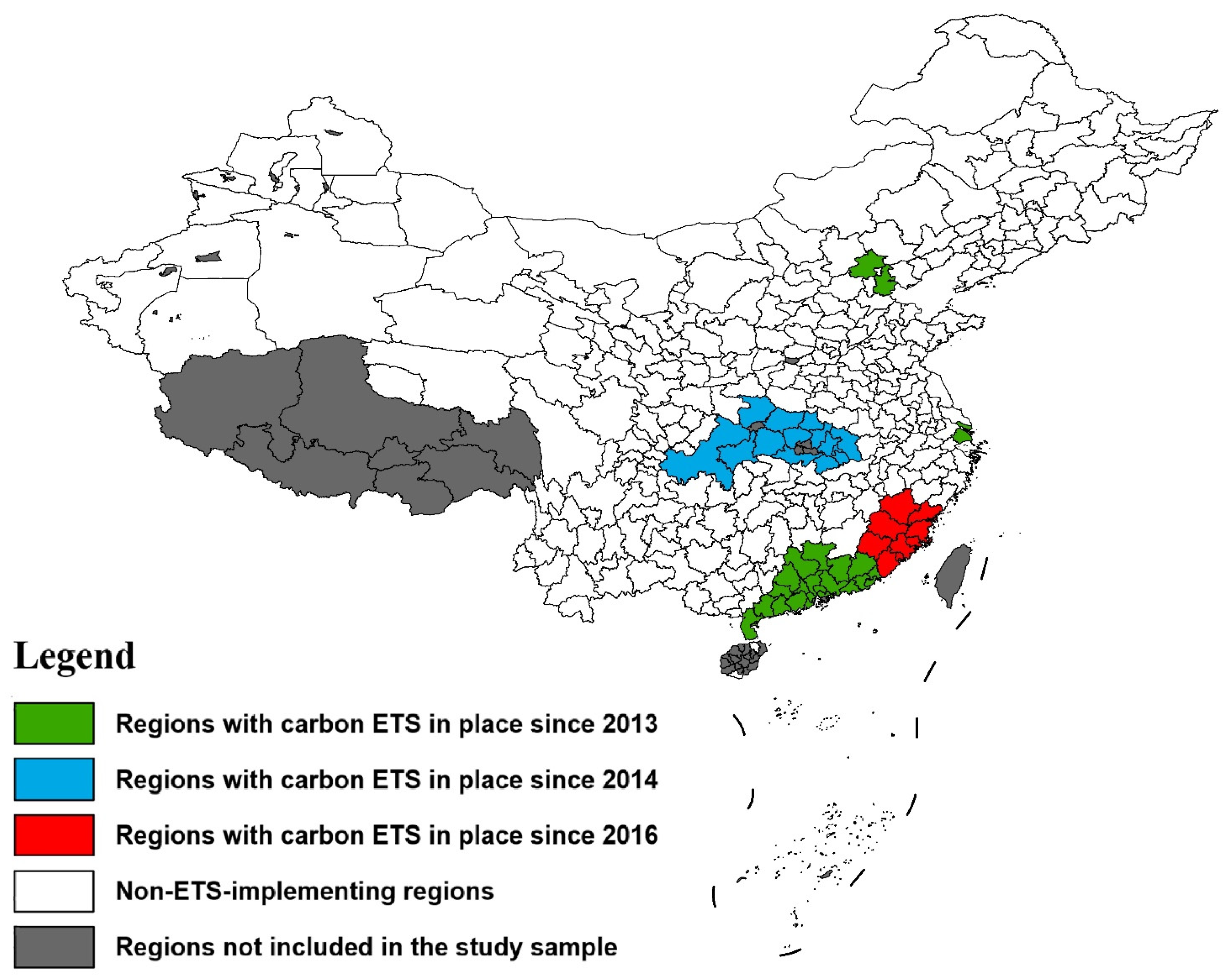 - Wu, X.; Qiu, W.; Guo, S. Assessing the effectiveness of emissions trading schemes: Evidence from China. Clim. Policy 2024, 24, 545–557. [Google Scholar] [CrossRef]