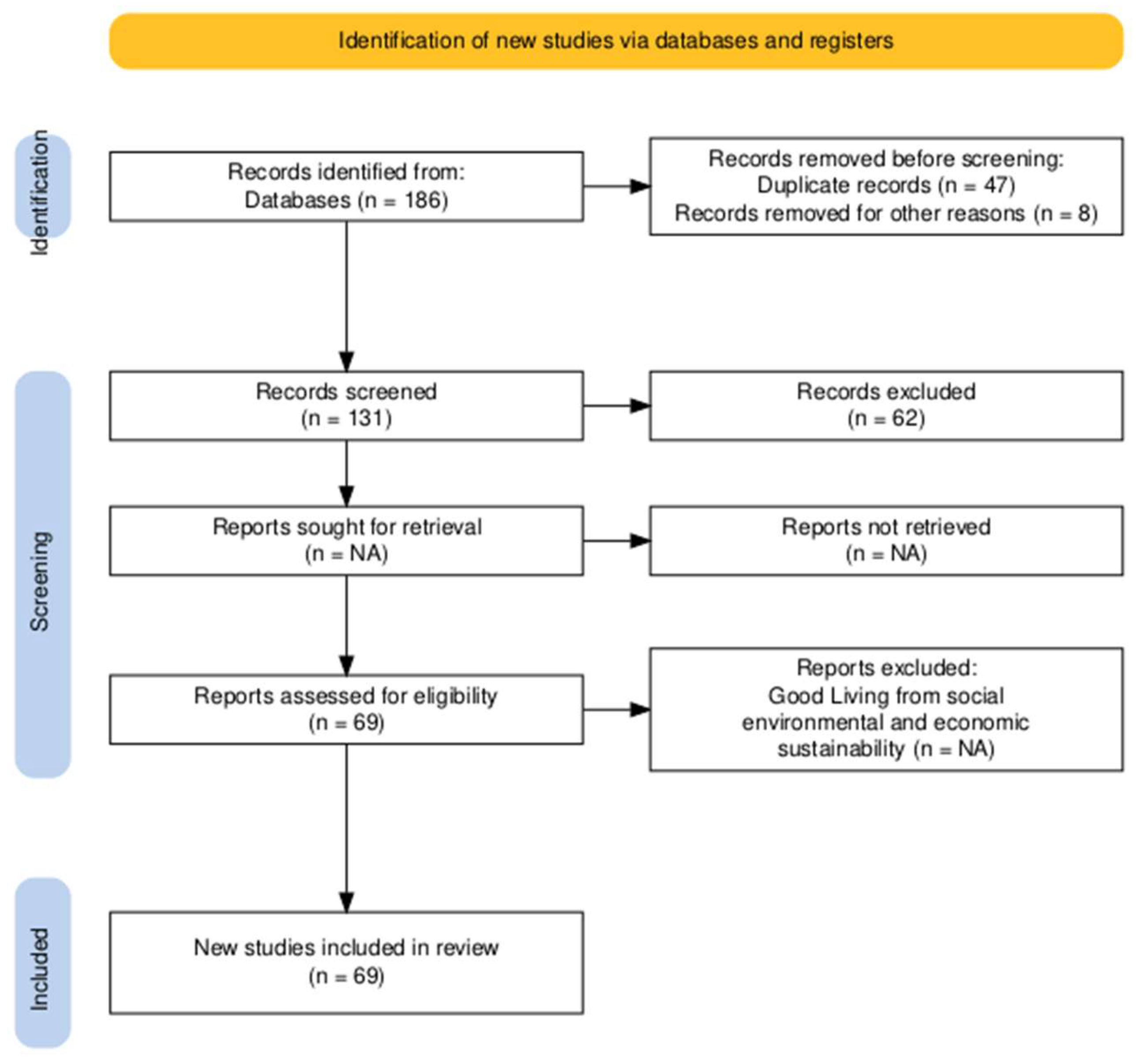 Table 1, a total of 186 records were identified across both databases, with 94 records retrieved from Scopus and 92 from Web of Science. Publications were filtered to include only those published between 2018 and 2024, corresponding to the period in which Buen Vivir consolidated as a contemporary sustainability paradigm within academic scholarship. After merging the two databases, 47 duplicate records were removed, and 8 articles that did not address Buen Vivir or Sumak Kawsay were excluded. Subsequently, 131 full-text documents were assessed for eligibility, resulting in a final sample of 69 documents that met the inclusion criteria across the environmental, social, and economic dimensions of sustainability. The final selection process was guided by a critical and contextualized reading of the literature, aimed at identifying conceptual contributions, theoretical tensions, and interpretive insights related to Buen Vivir (Sumak Kawsay) as a Latin American alternative to global sustainability. Artificial intelligence (AI) tools were used exclusively for linguistic and formatting purposes, including translation and grammar checking. All conceptual, methodological, analytical, and interpretive decisions were made entirely by the authors.