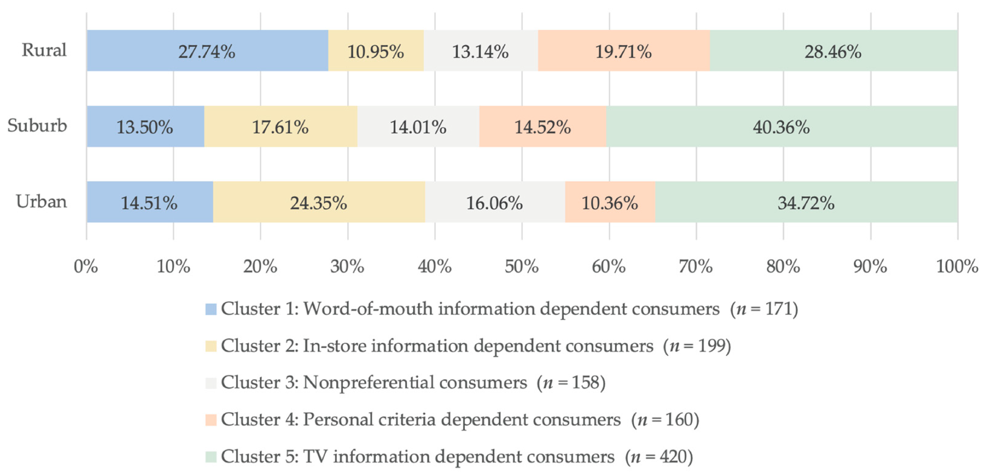 | Selection Criterion/Information Source | Cluster 1: Word-of-Mouth Information Dependent Consumers | Cluster 2: In-Store Information Dependent Consumers | Cluster 3: Nonpreferential Consumers | Cluster 4: Personal Criteria Dependent Consumers | Cluster 5: TV Information Dependent Consumers | Predictor Importance | |