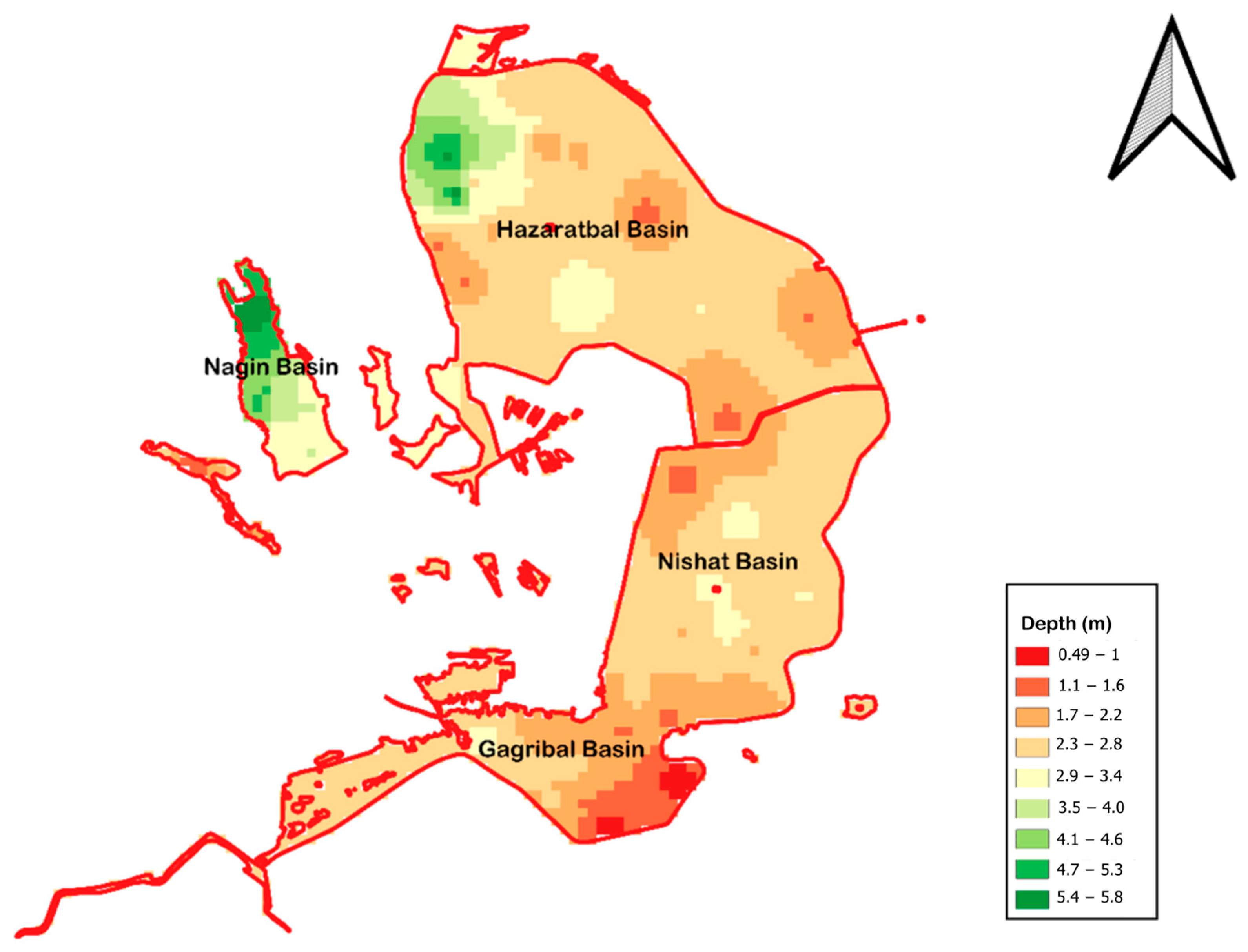| Mean depth | 1.4 m, (2 m in the Nagin basin) |