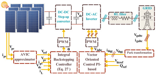 Figure 1 illustrates the GTPVS adopted in this paper. The PV array is used to transform sunlight into electricity. The next stage in the scheme is the DC-DC step-up converter, which is utilized to boost the extracted PV voltage to a required set point using an advanced control technique: AVIC-IBC. The AC side includes a three-phase inverter linked to the electrical grid, which is regulated by vector-oriented control based on a proportional–integral (PI) controller for providing the Ppv power injection.