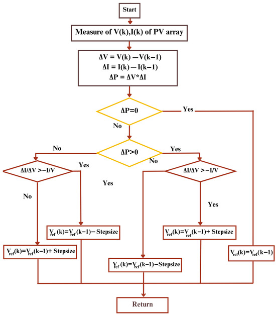 where k is a positive gain. When the operating point is distant from the MPP, the magnitude of is large, leading to an increased step size for rapid convergence. As the operating point converges toward the MPP, reduces, and the step size is automatically decreased, diminishing the steady-state fluctuations. The flowchart illustrating the Vref approximator is displayed in Figure 3.