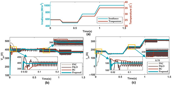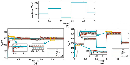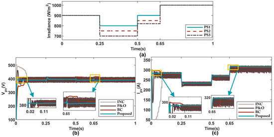 The fourth scenario includes Partial Shading Conditions (PSCs), in which the PVG of this system is divided into three distinct shading zones; each zone produces 41 kW, with a total of 123 kW. Every zone is exposed to different irradiance levels whilst the temperature is fixed at 25 °C. This scenario mimics a realistic non-uniform irradiation condition caused by building, cloud movement, or other atmospheric factors. Figure 12a presents three irradiations of PSC profiles, which were subjected to the three zones of the PVG. Figure 12b,c display the benchmarked signal analysis of Vpv and Ipv, respectively, which the proposed hybrid technique rapidly adapts to PSC variations in only 0.02 s with negligible fluctuations, in opposition to the other methods that require more convergence time.