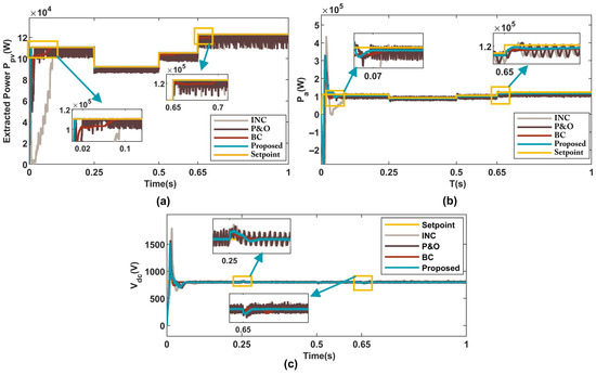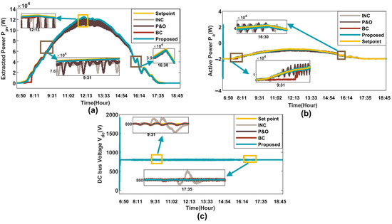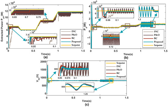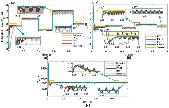 Figure 13a presents the extracted power Ppv by the four compared techniques, where the proposed one attains the setpoint in 0.02 s with insignificant fluctuations, in contrast to the BC method, which takes a longer time to stabilize at every PSC transition. The P&O and INC algorithms establish high fluctuations during both transit and steady states, increasing the power losses. Figure 13b,c show the active power and the Vdc bus voltage behaviors, respectively. These figures indicate that the proposed method stabilizes rapidly in only 0.07 s without exhibiting significant oscillations. Contrary to other benchmarked techniques, especially the P&O and INC, they display greater oscillations and a slower stabilization time.