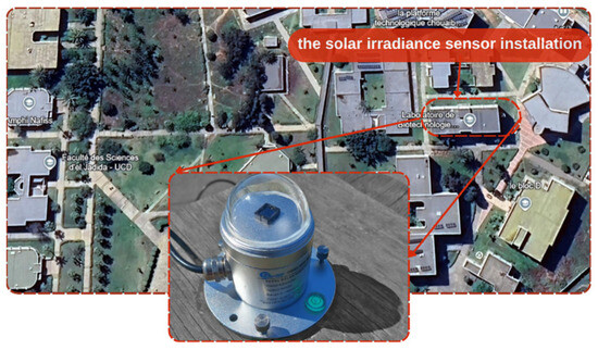 A real irradiance profile for a typical day was measured by an SEM228A solar irradiance sensor installed on the roof of the faculty of sciences’ research building, El-Jadida, Morocco (latitude: 33.23° N, longitude: −8.50° W), for improved data collection without disturbance, as shown in Figure 7.