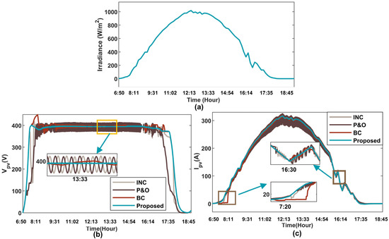 Figure 8a illustrates this practical real profile, which starts at 0 W/m2 in the early morning, peaks at 1040 W/m2 by 12:30 p.m., then gradually declines. This natural profile introduces realistic, unpredictable fluctuations, providing a more credible and challenging scenario to assess MPPT performance under actual operating conditions. As displayed in Figure 8b,c, the proposed hybrid MPPT method achieves fast MPP convergence with negligible variations in voltage and current, maintaining stable output throughout the time, contrary to the other benchmarked techniques, which exhibit high oscillations leading to significant power losses.