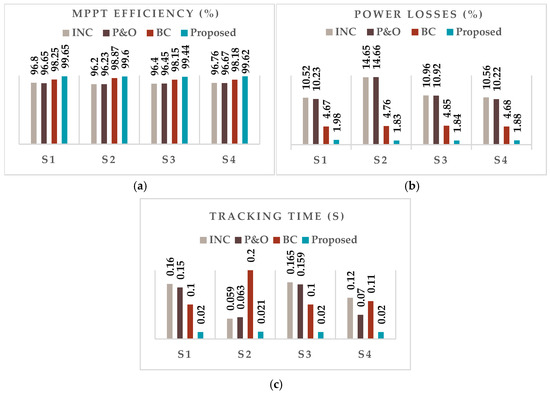 Performance index assessment under the four scenarios: (a) MPPT efficiency, (b) power losses, (c) tracking time.