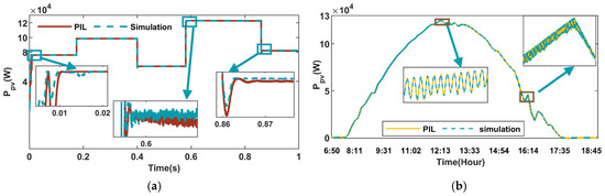 Figure 18a,b present the comparison of the PIL implementation and MIL using the extracted Ppv power of scenario 1 and scenario 2, respectively, as it reflects the MPPT efficiency. Both implementations in both tests were executed with the same sampling time of 10 µs to establish consistency. The performance metrics Mean Absolute Deviation (MAD) and Mean Absolute Percentage Deviation (MAPD) were calculated for both scenarios over steady-state time. The results indicate that MAD and MAPD for Ppv of scenario 1 are 13.5 W and 0.06102%, respectively, and for scenario 2 are 5.02 W and 0.03250%. These performance indices indicate superior fidelity between these two verification tests. The computational complexity of the proposed technique is low due to the AVIC’s simple arithmetic operations and the limited algebraic operations of IBC. Additionally, the total execution time per control cycle was below the adopted sampling time, establishing real-time practicability without processor overload.