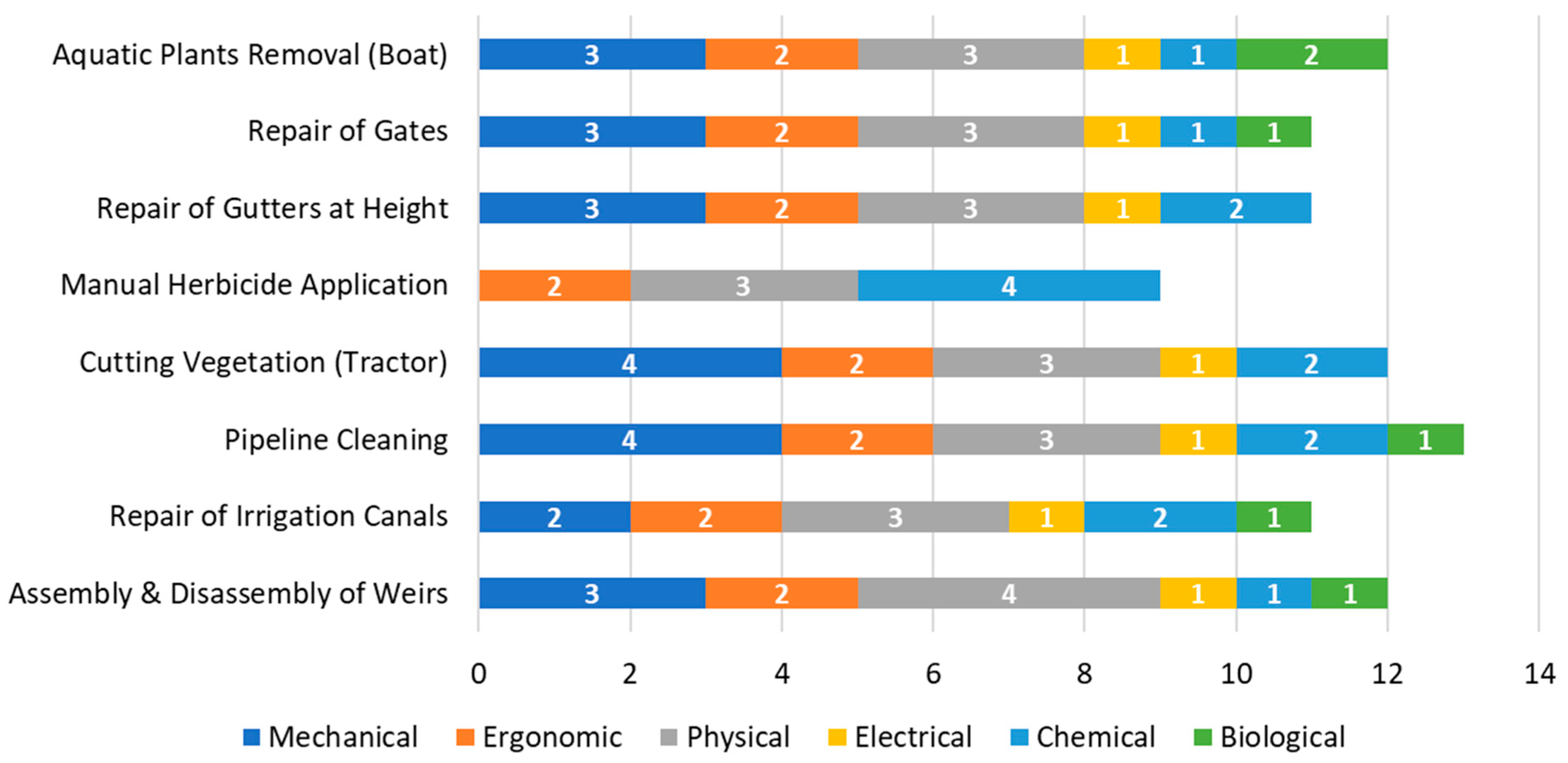 | (ii) Repair of Irrigation Canals | Cuts/falling objects | Posture/over-exertion | Slips, noise, vibrations | Electric shock | Dust/oils/infections |