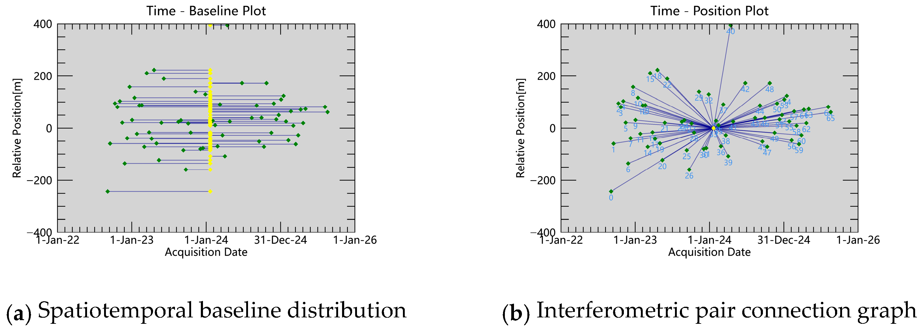 Figure 5), and a multi-master strategy was applied to maximize coherence within each subset. Each interferometric pair was precisely co-registered and differentially processed, and the Goldstein adaptive filter was used to enhance the quality of the interferograms. Phase unwrapping was carried out using a Delaunay minimum-cost-flow (MCF) algorithm.