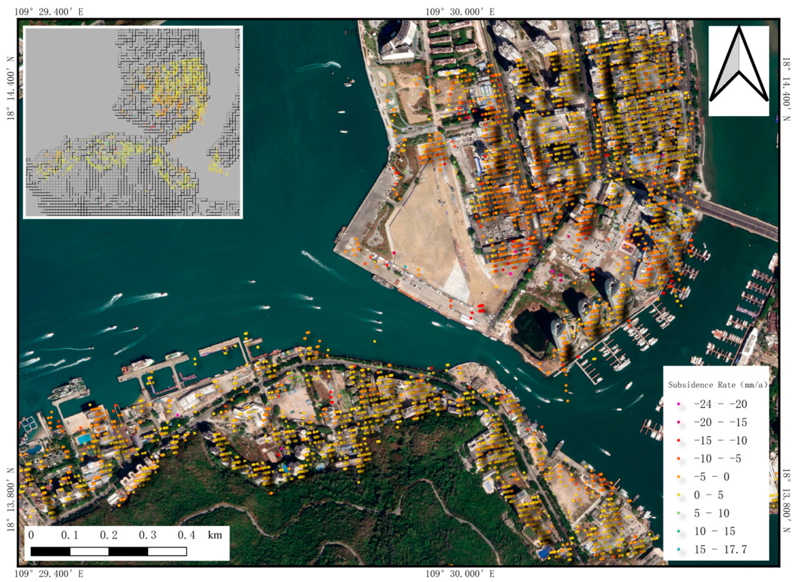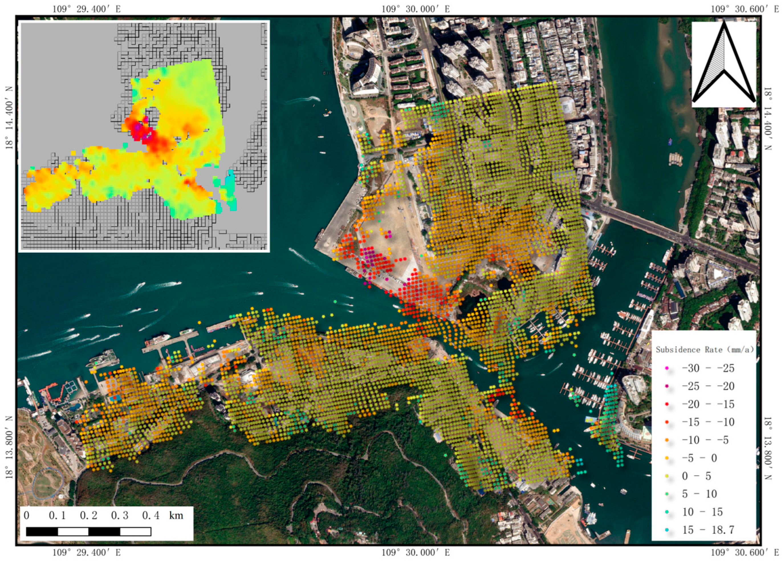 To accurately characterize the spatiotemporal distribution of construction-induced surface deformation along the Sanya Estuary Channel, this study integrates SBAS-InSAR and PS-InSAR for high-precision deformation-rate monitoring. The mean deformation fields and multi-epoch cumulative displacement maps are presented in