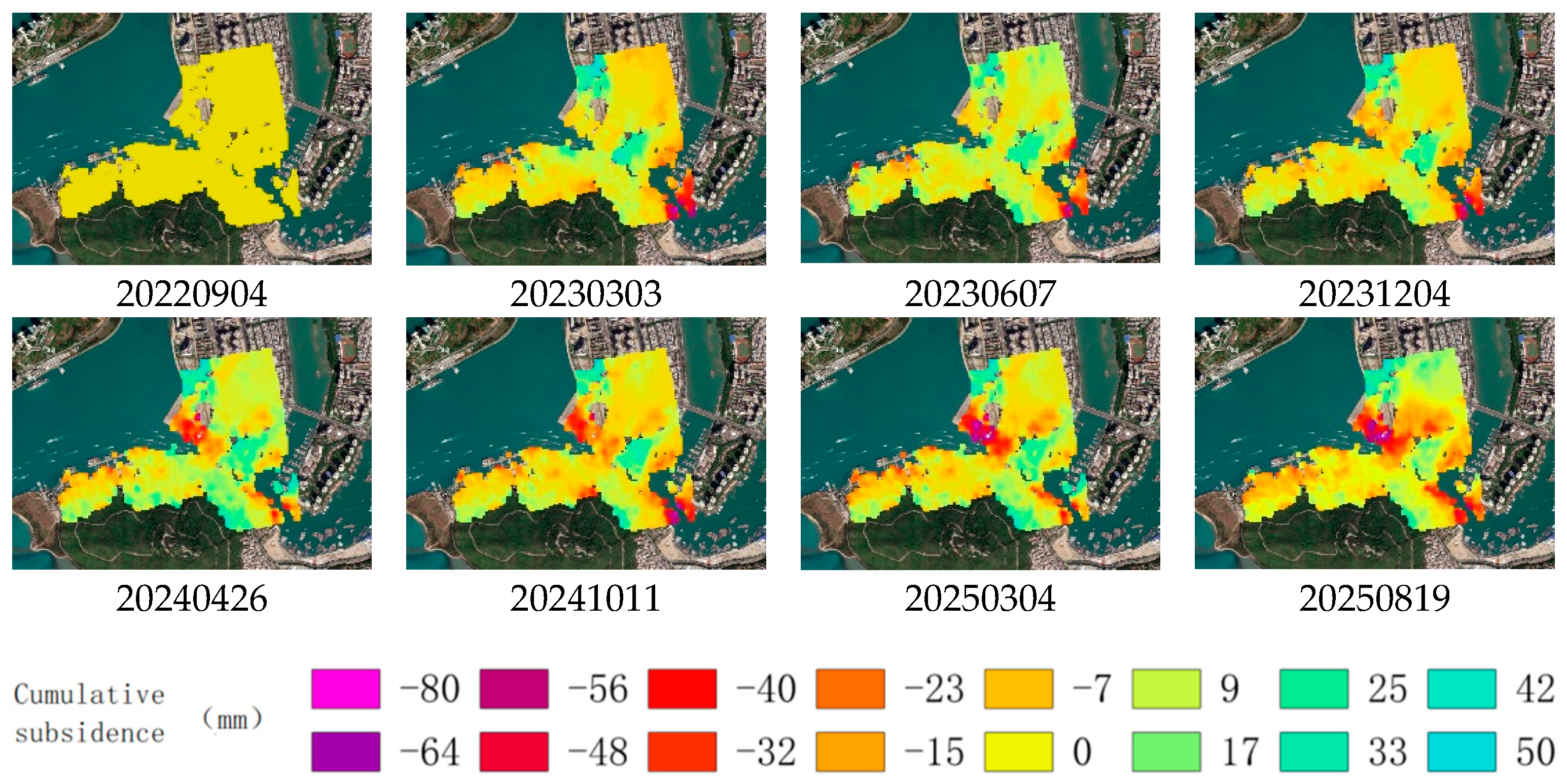 Figure 10). For each point, time-series deformation from September 2022 to August 2025 was extracted, and the corresponding cumulative settlement curves were derived (