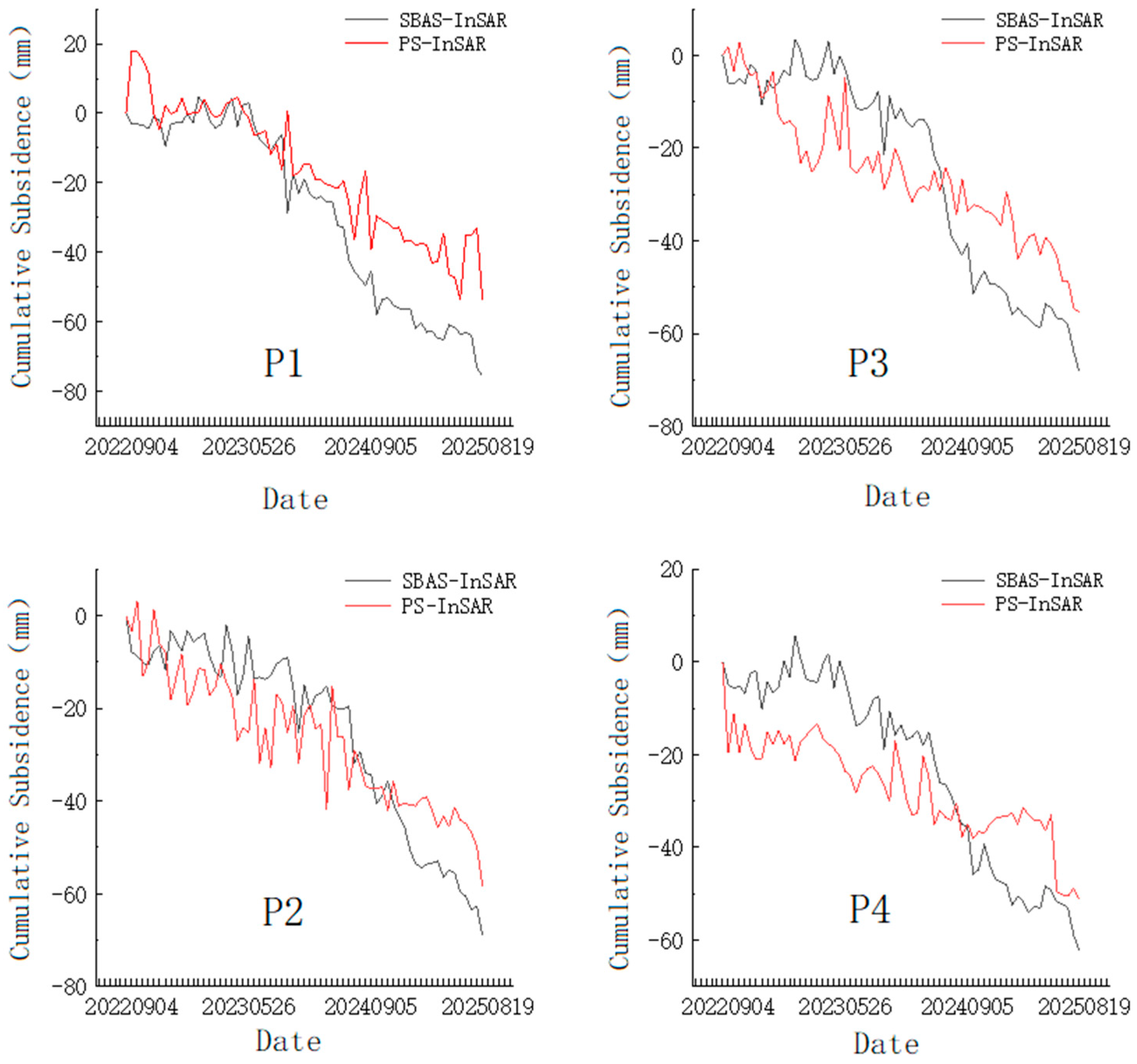 From a methodological perspective, the time-series curves obtained from SBAS-InSAR and PS-InSAR are broadly consistent in terms of overall trend at all points, which supports the reliability of the InSAR monitoring results. Nevertheless, noticeable discrepancies occur during certain periods, mainly due to the different sensitivities of the two techniques to various surface types—PS-InSAR is generally more stable over built-up structures, whereas SBAS-InSAR provides better spatial continuity over natural and reclaimed surfaces.