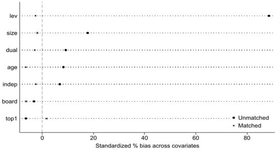 To further address potential sample selection bias that might affect the study’s conclusions, this research employs the propensity score matching (PSM) framework [41], using board size, proportion of independent directors, ownership concentration, dual roles, firm size, firm age, and leverage ratio as matching covariates for robustness testing. A binary dummy variable is constructed to indicate whether a firm has patient capital, using the median value of patient capital as the threshold. The application of PSM mitigates sample selection bias and ensures comparability between the treatment and control groups. Figure 1 illustrates that the standardized bias for each variable is substantially reduced after matching.