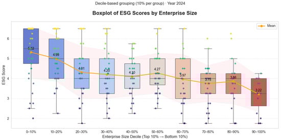 Companies in the top 50% of total assets each year are classified as large enterprises, with the remainder considered small and medium-sized enterprises (SMEs) [45]. Regression results in Columns (3) and (4) of Table 7 show that patient capital significantly enhances ESG performance for large enterprises (coefficient = 0.133, p < 0.01), while the effect for SMEs is not significant. These results indicate that large firms, with abundant resources and mature governance structures, can effectively leverage patient capital to improve environmental, social, and governance outcomes, supporting Hypothesis H5. In contrast, SMEs face resource and execution constraints, limiting the impact of patient capital. Figure 3 illustrates this heterogeneity, highlighting the significant effect for large firms and the negligible effect for SMEs.