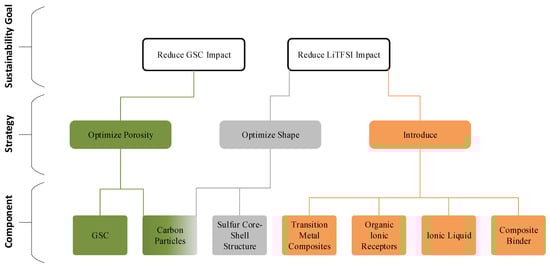 The identified eco-design solutions from patented LSBs were searched and collected from those related to graphene and LiTFSI, which are the main sources of impacts. These solutions include optimizing cathode porosity, employing core–shell structures, introducing transition metal composites, incorporating organic ionic receptors, using ionic liquids, and utilizing composite binders.