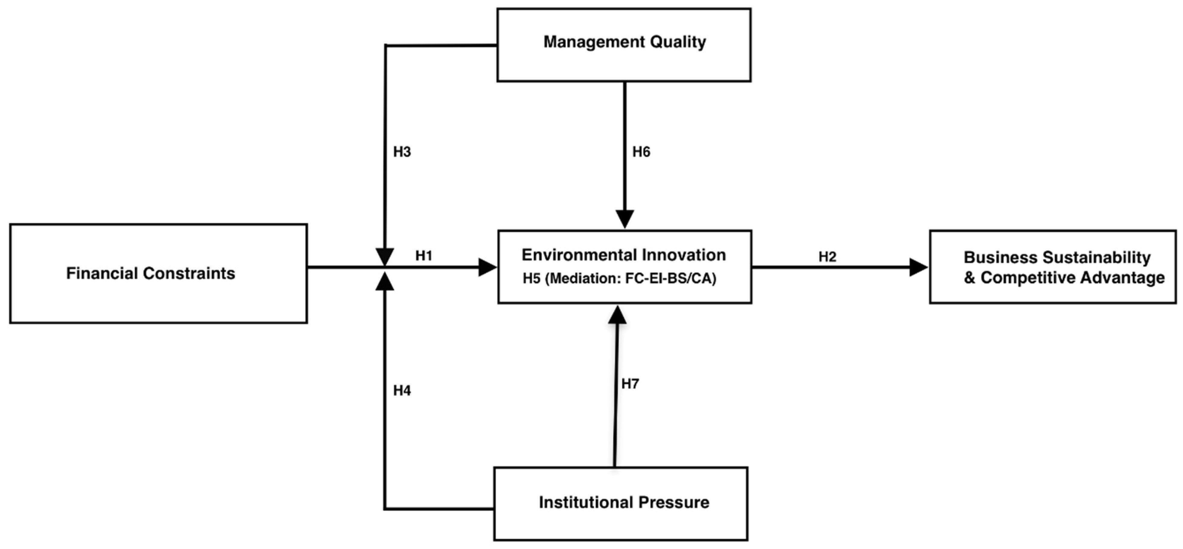 While financial constraints tend to depress environmental innovation (H1), environmental innovation is expected to enhance business sustainability and competitive advantage (H2). However, firms do not operate in a vacuum. The extent to which financial constraints suppress eco-innovation depends on both internal capabilities and the external institutional environment [