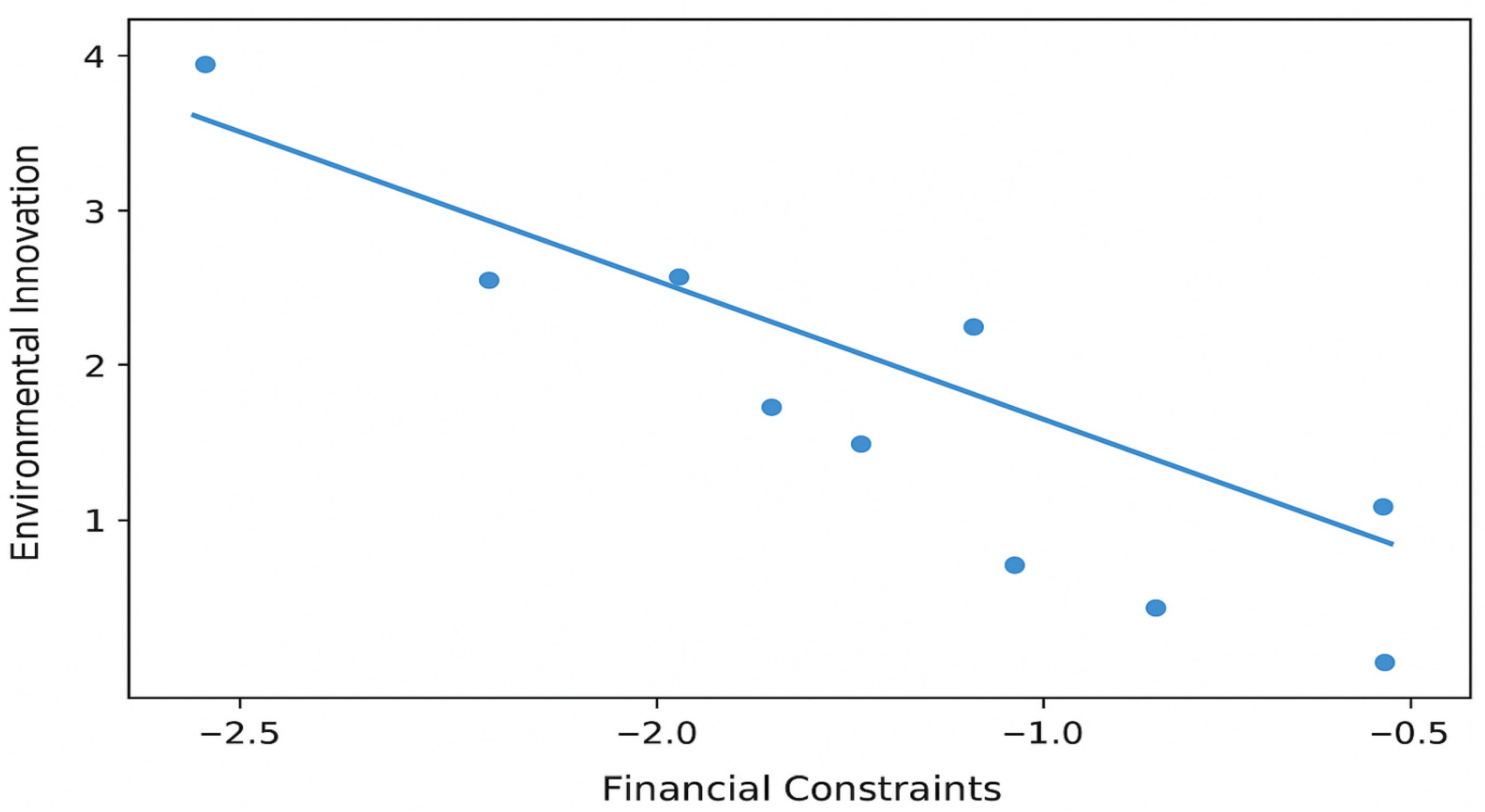 Figure 2 illustrates the effect of financial constraints on environmental innovation. The horizontal axis (x) shows financial constraints, while the vertical axis (y) shows Environmental Innovation (predicted value/standardized). The downward-sloping line depicts the predicted level of environmental innovation at different levels of financial constraint. Each point represents the firm-level average of financial constraints (FC) and environmental innovation (EI) over the 2012–2024 sample period. The solid line shows the fitted regression line from Model (1), illustrating the negative relationship between FC and EI after controlling for firm size, age, R&D intensity, and industry. This indicates that, holding controls constant, a one-standard-deviation increase in financial constraints is associated with a ~0.37 standard-deviation decrease in environmental innovation. Firms facing greater liquidity shortages, higher leverage, or lower interest-coverage scores allocate fewer resources to green R&D, green patents, and other EI activities. The Figure confirms H1: financial constraints hinder environmental innovation. The slope’s steepness indicates the strength of this inhibitory effect. In our sample, the effect is moderate-to-large (β = −0.37), suggesting financing barriers are a meaningful impediment to eco-innovation for many firms.