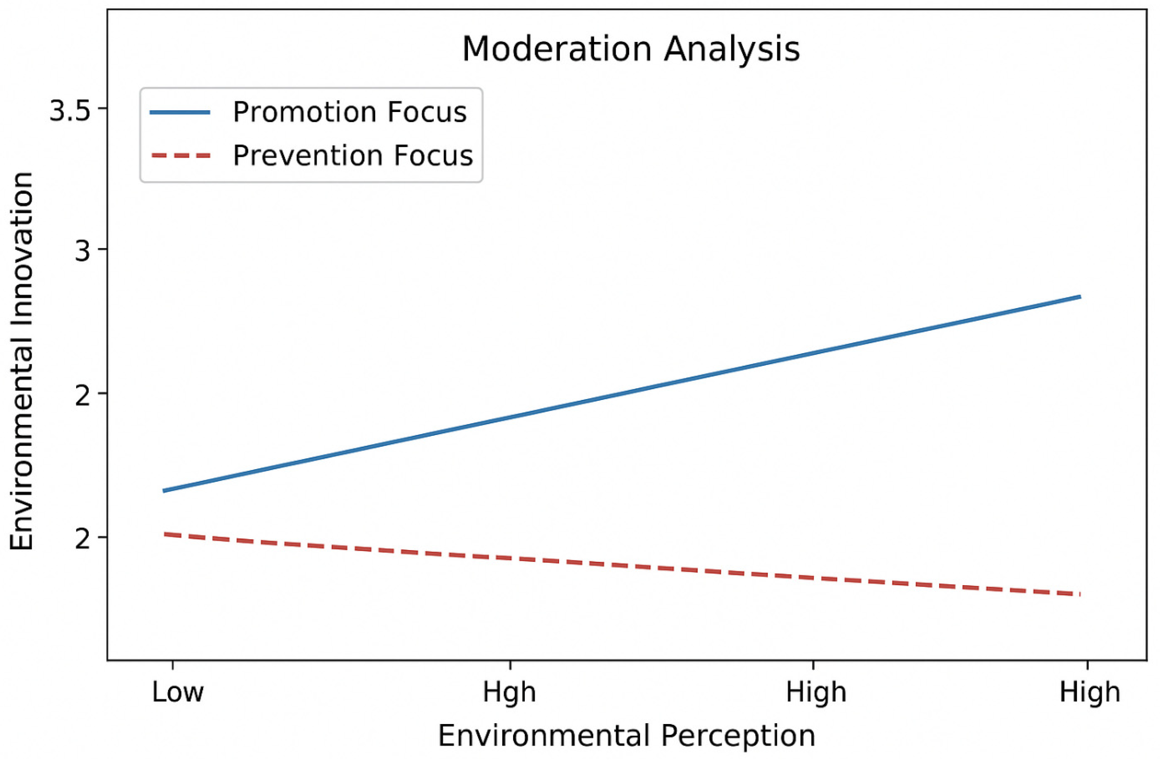 Figure 3 presents the moderation analysis. The horizontal axis (x) represents financial Constraints (standardized), and the vertical axis (y) is the predicted environmental innovation. The two plotted lines represent low management quality and high management quality. The space between the two lines shows how the relationship between financial constraints and EI differs by managerial capability. Analyzing the Figure, it is clear that the interaction term FC × MQ was positive and significant (interaction β ≈ +0.127,