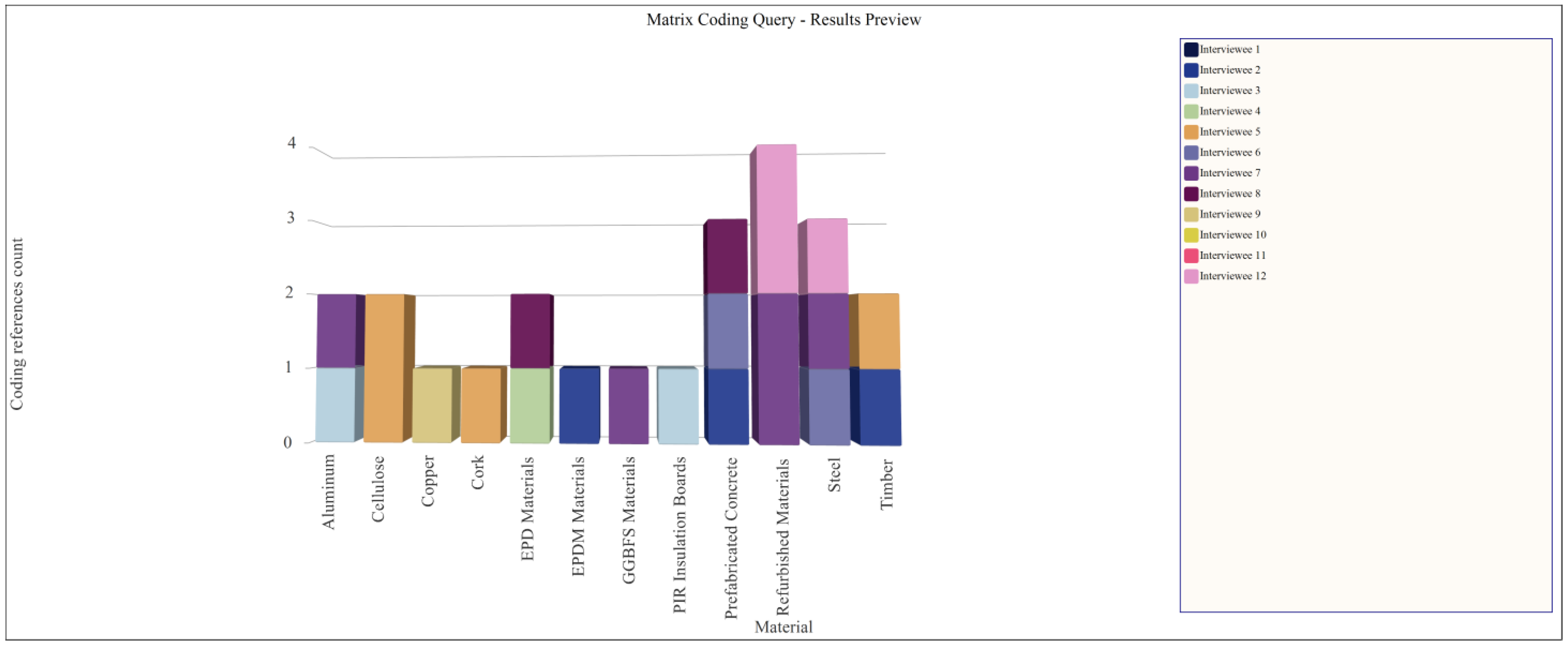 Table 1. The interviewees played different roles in their organizations in the building sector. Their roles have close relevance to NZEBs during different phases. With their consent, all interviews were recorded and transcribed to ensure credibility and integrity. This study utilized thematic analysis to analyze the data collected from the interviews. The interview transcripts were reviewed before being imported to NVivo, which made it easier to identify and code the key concepts as themes and patterns. Each node represents a coded keyword or phrase in interview transcripts. Parent and child nodes were created after coding. Word Clouds were used to show the frequency of each node and the relationship between different nodes. Matrix Coding Queries were employed to visualize and compare the interviewees’ responses to technologies, materials, and strategies for NZEBs.